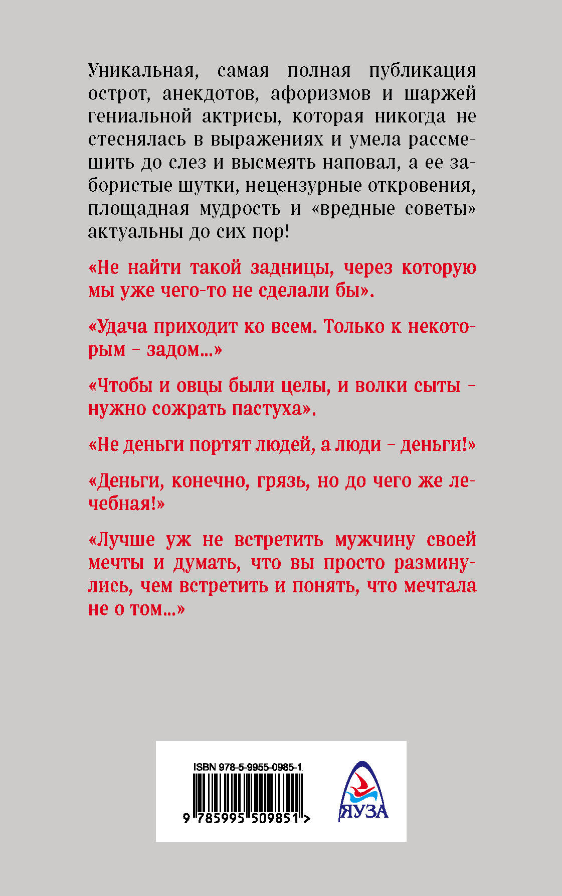Уникальная, самая полная публикация острот, анекдотов, афоризмов и шаржей гениальной актрисы, которая никогда не стеснялась в выражениях и умела рассмешить до слез и высмеять наповал, а ее забористые шутки, нецензурные откровения, площадная мудрость и «вредные советы» актуальны до сих пор! «Не найти такой задницы, через которую мы уже чего-то ни сделали бы» «Удача приходит ко всем. Только к некоторым - задом…» «Чтобы и овцы были целы, и волки сыты - нужно сожрать пастуха» «Не деньги портят людей, а люди - деньги!» «Деньги, конечно, грязь, но до чего же лечебная!» «Лучше уж не встретить мужчину своей мечты и думать, что вы просто разминулись, чем встретить и понять, что мечтала не о том…» «Красота - страшная сила, и с каждым годом всё страшнее и страшнее…»| Издательство | Яуза-пресс ООО |
