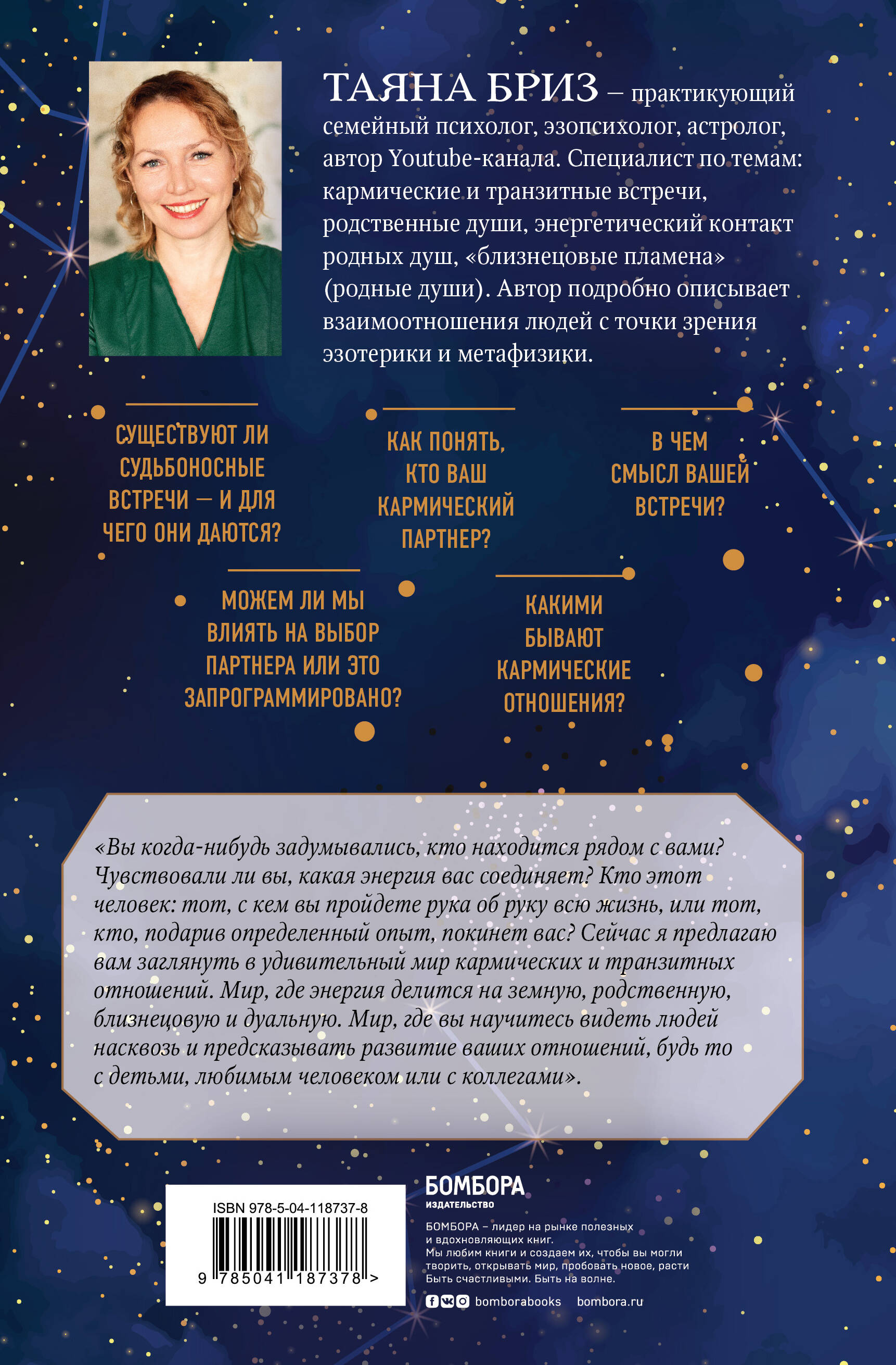Каждому из нас судьба дает свои кармические встречи, мы не выбираем, с кем пойдем по жизни. У каждого из нас свой путь, свои кармические отношения. И все же есть определенные схожие признаки, которые позволяют выделить отдельные типы (группы) межличностных взаимоотношений. В этой книге автор дает подробную характеристику четырех видов энергии: родственной, земной, дуальной, близнецовой. Рассказывает, что нам нужно про это знать и как применять в жизни. Чтобы быть счастливыми и успешными. В реальной жизни бывает то, что бывает чаще, а не то, что нам представляется. Таяна, мудрейшая женщина, опытный практикующий семейный психолог, долгое время разбирала сложные и запутанные случаи в сфере личных отношений, называя их кармическими. Для себя такие непростые отношения автор назвала кармическими. Индивидуальная практическая работа с людьми помогла Таяне лучше изучить человеческое взаимодействие и основные причинно-следственные связи, которые влияют на жизнь любого из нас. Книга отвечает на вопросы: - Как отработать ошибки предыдущих отношений? - Как правильно выбрать партнера? - Почему так получается с нами? - Какие такие уроки нам поданы звездами? В уникальной книге автор делится только своим мнением, без ссылки на какие-либо источники. Знания, которые ей даны, не взяты из книг или интернета, это симбиоз профессионального опыта, интуиции и аналитической работы. А это бесценно. Пережитое, вылеченное, осмысленное, разложенное по полочкам, с примерами положительными и отрицательными. Судьба часто связывает людей разных энергий. Такой контакт может быть непростым, особенно в любовных и семейных отношениях. Между партнерами не всегда будет взаимопонимание, так как они не схожи во взглядах и ощущениях. Качество их совместной жизни во многом зависит от них. Смогут ли они договориться и прийти к согласию, решают сами партнеры. Общие кармические задачи будут держать людей вместе ровно столько, сколько необходимо для их выполнения. Так лучше знать всю матчасть заранее, чем в конце жизни дойти до всему самому. Вооружайтесь полезным знанием и живите вместе долго и счастливо.| Издательство | ООО "Издательство "Эксмо" |