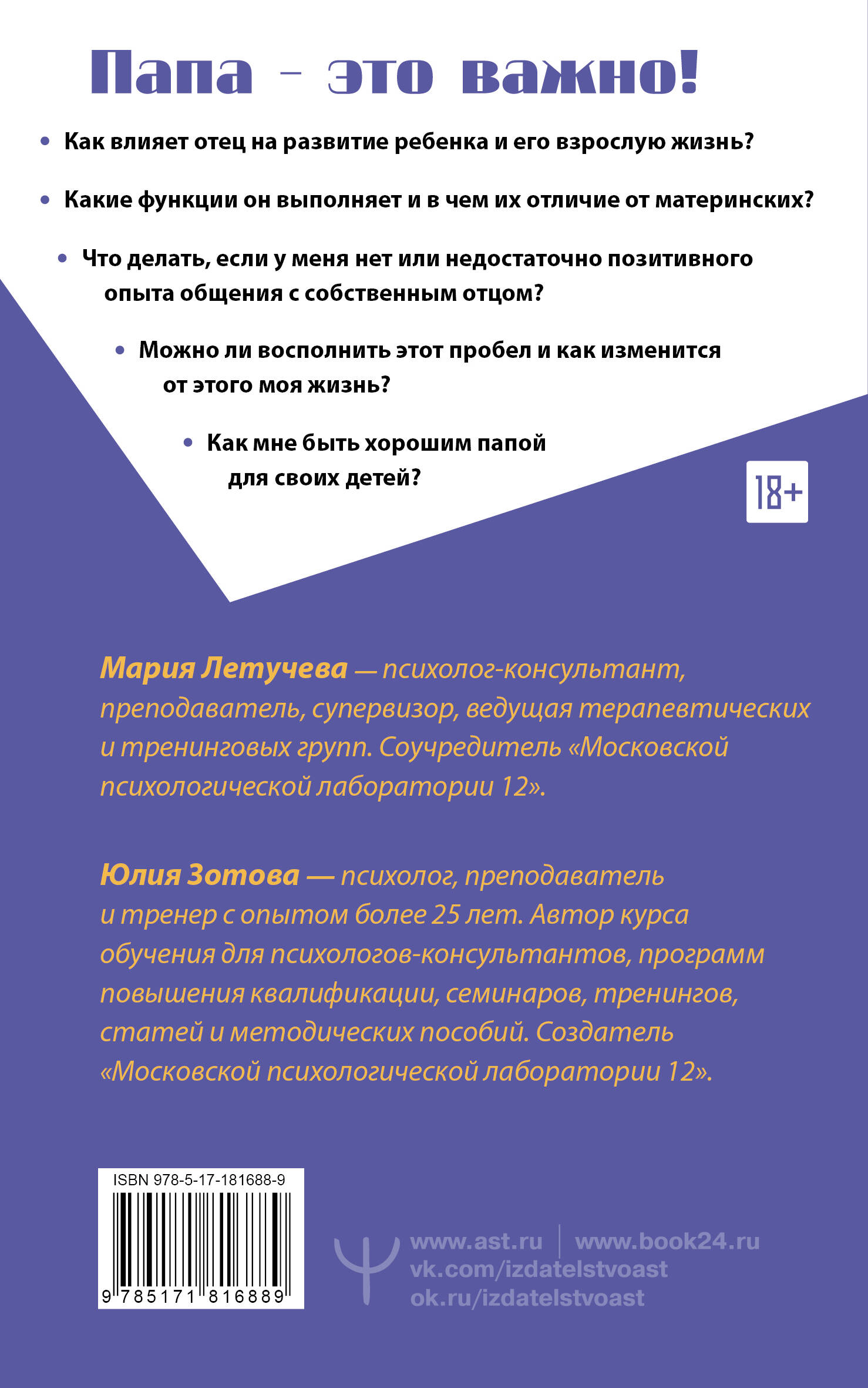Папа - это важно! Психологи и педагоги, мамы и папы, а также дети, уже ставшие взрослыми, эта книга - для вас! Вы узнаете о значении фигуры отца для ребенка, о влиянии контакта с папой на все сферы жизни и самоотношение, о том, почему он так важен в жизни каждого человека. • Как влияет отец на развитие ребенка и его взрослую жизнь? • Какие функции он выполняет и в чем их отличие от материнских? • Что делать, если нет или недостаточно позитивного опыта общения с собственным отцом? • Можно ли восполнить этот пробел и как изменится от этого жизнь? • Как быть хорошим папой для своих детей? Ответам на эти вопросы посвящена книга психологов Юлии Зотовой и Марии Летучевой. Это третье издание бестселлера "Все дело в папе". По сравнению с первым изданием авторы расширили содержание подробным описанием отцовских функций, а также переработали раздел о влиянии отца на мужские сценарии. Появилась глава с примерами позитивных сценариев в отношениях. В книге много практических рекомендаций и примеров психотерапевтической работы с отцовской фигурой, которые будут полезны практикующим специалистам и студентам, обучающимся на психологов, а также всем, кто хочет найти ответы на вопросы, касающиеся роли отца в жизни человека: • терапевтические техники и стратегии в работе с отцовской фигурой для оказания более эффективной психологической помощи; • инструменты, помогающие точно определить, когда дело именно в папе; • способы помощи людям, имеющим проблемы в отношениях с отцом. Предлагаемые авторами материалы и упражнения помогают читателю войти в контакт с образом собственного отца, наполниться ресурсом от этой фигуры, принять его сильные и слабые стороны, внутренне примириться с ним и в конечном итоге почувствовать себя более целостными и счастливыми. Даже те, кто вырос без папы, начинают ощущать его значимое присутствие в своей жизни или по меньшей мере получают возможность работать с этой длительно замалчиваемой темой в процессе собственной личной терапии. Книга будет интересна всем, для кого тема отношений с отцом актуальна и эмоционально заряжена. Книга написана языком, доступным для широкого круга читателей. Но это не развлекательное чтиво, а практическое руководство, основанное на многолетних наблюдениях авторов и их открытиях в работе с клиентами. Вы получите рекомендации, с помощью которых сможете что-то осознать, переосмыслить и даже изменить. Книга в твердом переплете.| Издательство | Издательство "АСТ" |