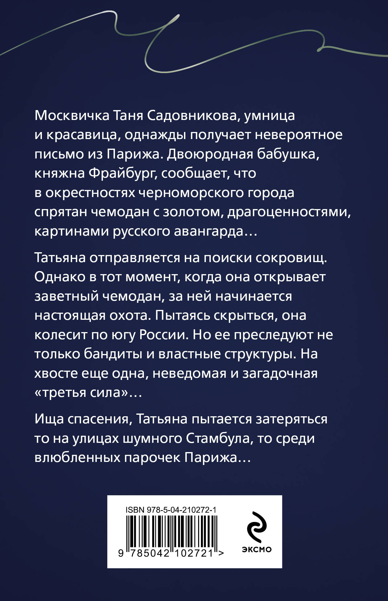 Москвичка Таня Садовникова, умница и красавица, однажды получает невероятное письмо из Парижа. Двоюродная бабушка, княжна Фрайбург, сообщает, что в окрестностях черноморского города спрятан чемодан с золотом, драгоценностями, картинами русского авангарда… Татьяна отправляется на поиски сокровищ. Однако в тот момент, когда она открывает заветный чемодан, за ней начинается настоящая охота. Пытаясь скрыться, она колесит по югу России. Но ее преследуют не только бандиты и властные структуры.. На хвосте еще одна, неведомая и загадочная «третья сила»… Ища спасения, Татьяна пытается затеряться то на улицах шумного Стамбула, то среди влюбленных парочек Парижа… Блеск драгоценных камней на протяжении веков очаровывает и застилает глаза. Их сила притяжения такова, что люди порой не останавливаются ни перед чем, стремясь завладеть ими. Тогда это приводит к преступлениям, о которых рассказывают лучшие отечественные детективы из серии «Преступные камни».| Издательство | ООО "Издательство "Эксмо" |
