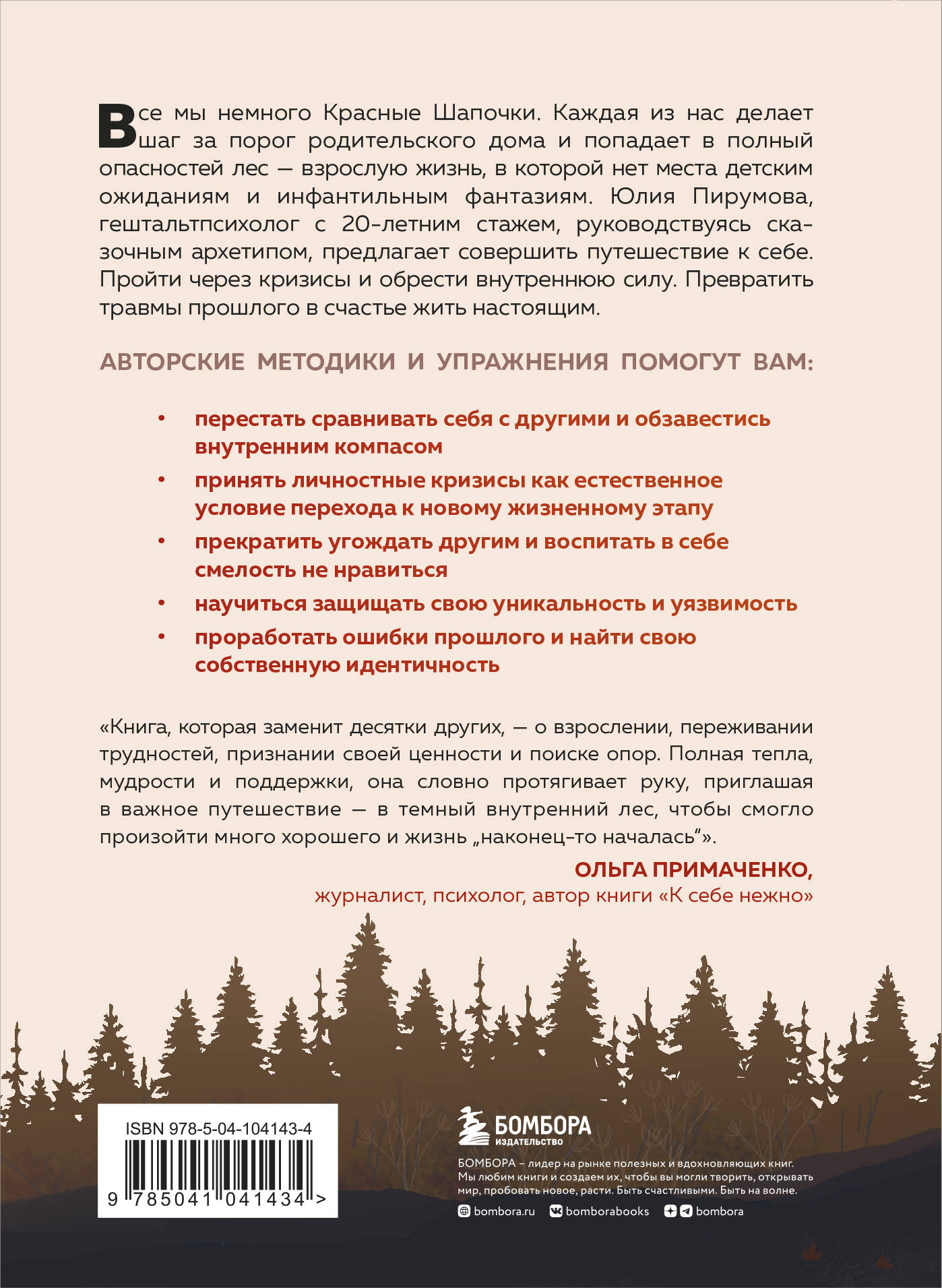 В этой книге Юлия Пирумова дает пошаговый план по перепросмотру своей жизни с учетом особенностей и вызовов нескольких возрастных периодов (0-20, 20-30, 30-40, 40-50 лет). Помимо возрастных кризисов каждая женщина проходит через инициирующие события - предательство, измена, серьезная болезнь, смерть родителей, развод и другие, - которые травмируют женскую психику. Задача автора - помочь читательницам трансформировать травмы во внутренние опоры и ценности (дары путешествия). На основании этого увидеть свою личную историю, как опору для женской идентичности. ЦИТАТЫ: «Боль и горе неизбежных потерь и разочарований, если с ними столкнуться, быстро стирают безупречный макияж. Но это уже хороший вариант развития событий. Потому что однажды благодаря этому мы становимся Настоящими». «Путешествие Красной Шапочки - это символическая тропинка, по которой неизбежно идем мы все». «Очищенный от испытаний, трудностей и ошибок женский путь - это, во‑первых, просто фантастика. А во‑вторых, тупик, который никуда не ведет». «Красная Шапочка обязательно выходит за порог, неизменно нарушает запрет и окунается в правду жизни, обретая свое собственное знание». «Наша задача - не сравнивать сюжет своей жизни с идеальным сценарием. Иначе мы проиграем уже на старте в попытках соответствовать совершенным моделям».| Издательство | ООО "Издательство "Эксмо" |