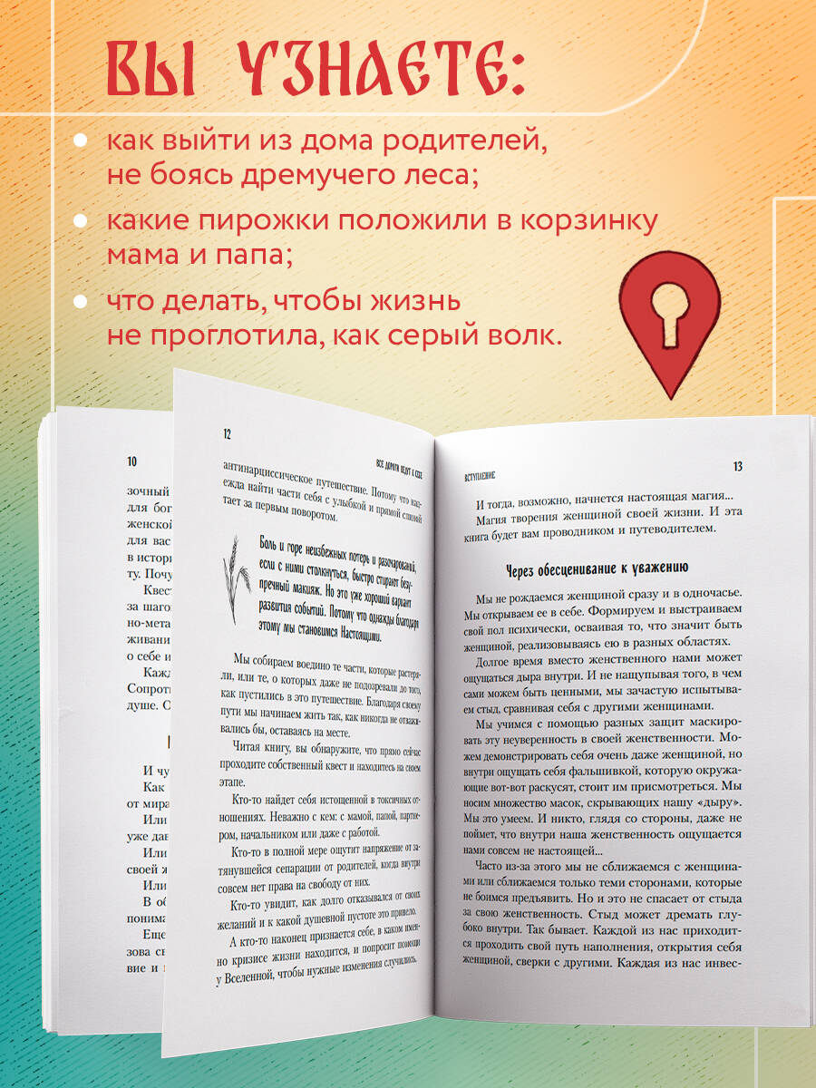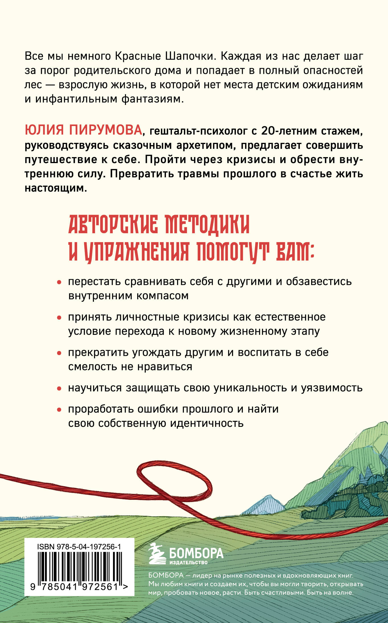 В этой книге Юлия Пирумова дает пошаговый план по перепросмотру своей жизни с учетом особенностей и вызовов нескольких возрастных периодов (0-20, 20-30, 30-40, 40-50 лет). Помимо возрастных кризисов каждая женщина проходит через инициирующие события - предательство, измена, серьезная болезнь, смерть родителей, развод и другие, - которые травмируют женскую психику. Задача автора - помочь читательницам трансформировать травмы во внутренние опоры и ценности (дары путешествия). На основании этого увидеть свою личную историю, как опору для женской идентичности. ЦИТАТЫ: «Боль и горе неизбежных потерь и разочарований, если с ними столкнуться, быстро стирают безупречный макияж. Но это уже хороший вариант развития событий. Потому что однажды благодаря этому мы становимся Настоящими». «Путешествие Красной Шапочки - это символическая тропинка, по которой неизбежно идем мы все». «Очищенный от испытаний, трудностей и ошибок женский путь - это, во‑первых, просто фантастика. А во‑вторых, тупик, который никуда не ведет». «Красная Шапочка обязательно выходит за порог, неизменно нарушает запрет и окунается в правду жизни, обретая свое собственное знание». «Наша задача - не сравнивать сюжет своей жизни с идеальным сценарием. Иначе мы проиграем уже на старте в попытках соответствовать совершенным моделям».