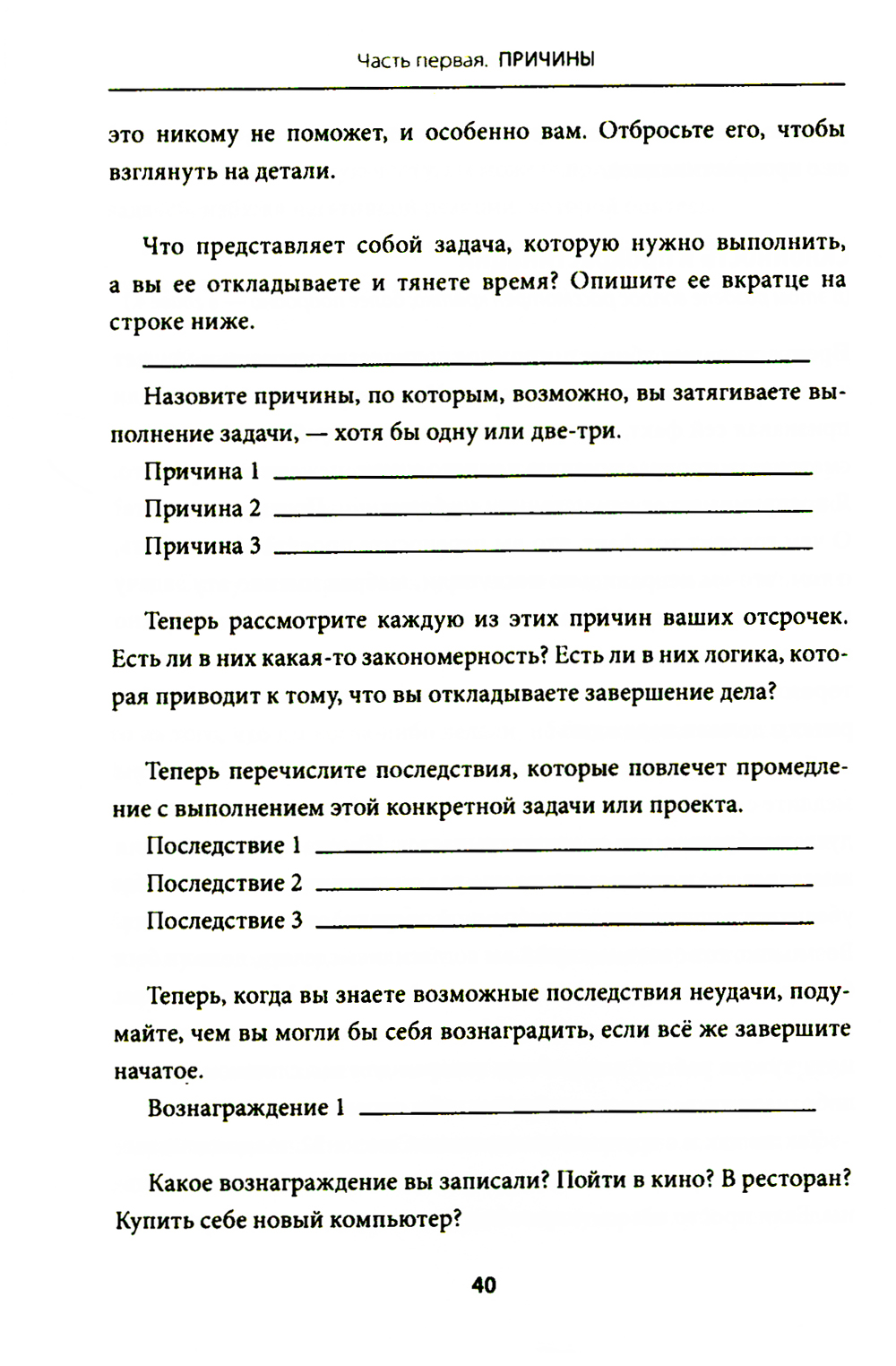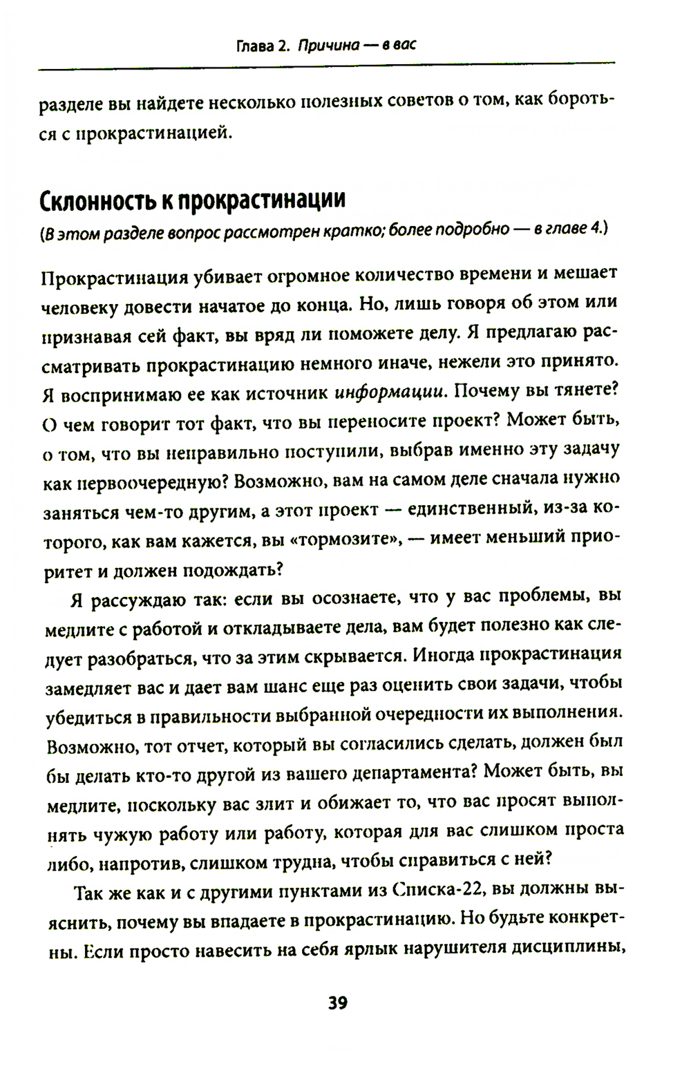 В своей новой книге замечательный американский психолог и бизнес-тренер Джен Ягер максимально полно исследует вопросы управления временем. Она проходит вместе с читателями «все круги» самоанализа, находя причины прокрастинации и рассеянности в тайнах человеческого характера, и показывает возможный путь исправления. Джен верит, что человек может и должен быть хозяином своего времени, своего дела и своей жизни, а потому - призывает освоить удивительные техники саморегуляции и планирования на ближайшее время и годы вперед. В конце каждой главы предложены упражнения для уяснения и закрепления теоретического материала. Дополняет издание шаблон дневника успешного человека. Предназначено широкому кругу читателей - собственникам и менеджерам предприятий, государственным служащим, фрилансерам и студентам средних специальных и высших учебных заведений.| Издательство | Олимп-Бизнес |