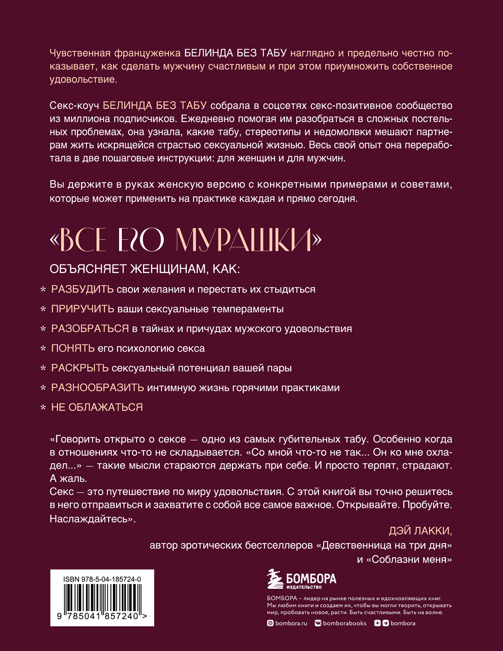 Чувственная француженка Белинда Без Табу наглядно и предельно честно показывает, как сделать мужчину счастливым и при этом приумножить собственное удовольствие. Секс-коуч Белинда Без Табу собрала в соцсетях секс-позитивное сообщество из миллиона подписчиков. Ежедневно помогая им разобраться в сложных постельных проблемах, она узнала, какие табу, стереотипы и недомолвки мешают партнерам жить искрящейся страстью сексуальной жизнью. Весь свой опыт она переработала в две пошаговые инструкции: для женщин и для мужчин. Перед вами женская версия с конкретными примерами и советами, которые может применить на практике каждая и прямо сегодня. «Все ЕГО мурашки» объясняет женщинам, как: - Разбудить свои желания и перестать их стыдиться. - Приручить ваши сексуальные темпераменты. - Разобраться в тайнах и причудах мужского удовольствия. - Понять его психологию секса. - Раскрыть сексуальный потенциал вашей пары. - Разнообразить интимную жизнь горячими практиками. - Не облажаться. ОТЗЫВ: «Говорить открыто о сексе - одно из самых губительных табу. Особенно, когда в отношениях что-то не складывается. "Со мной что-то не так... Он ко мне охладел..." - такие мысли стараются держать при себе. И просто терпят, страдают. А жаль. Секс - это путешествие по миру удовольствия. С этой книгой вы точно решитесь в него отправиться и захватите с собой все самое важное. Открывайте. Попробуйте. Наслаждайтесь». - Дэй Лакки, автор эротических бестселлеров «Девственница на три дня» и «Соблазни меня»| Издательство | ООО "Издательство "Эксмо" |