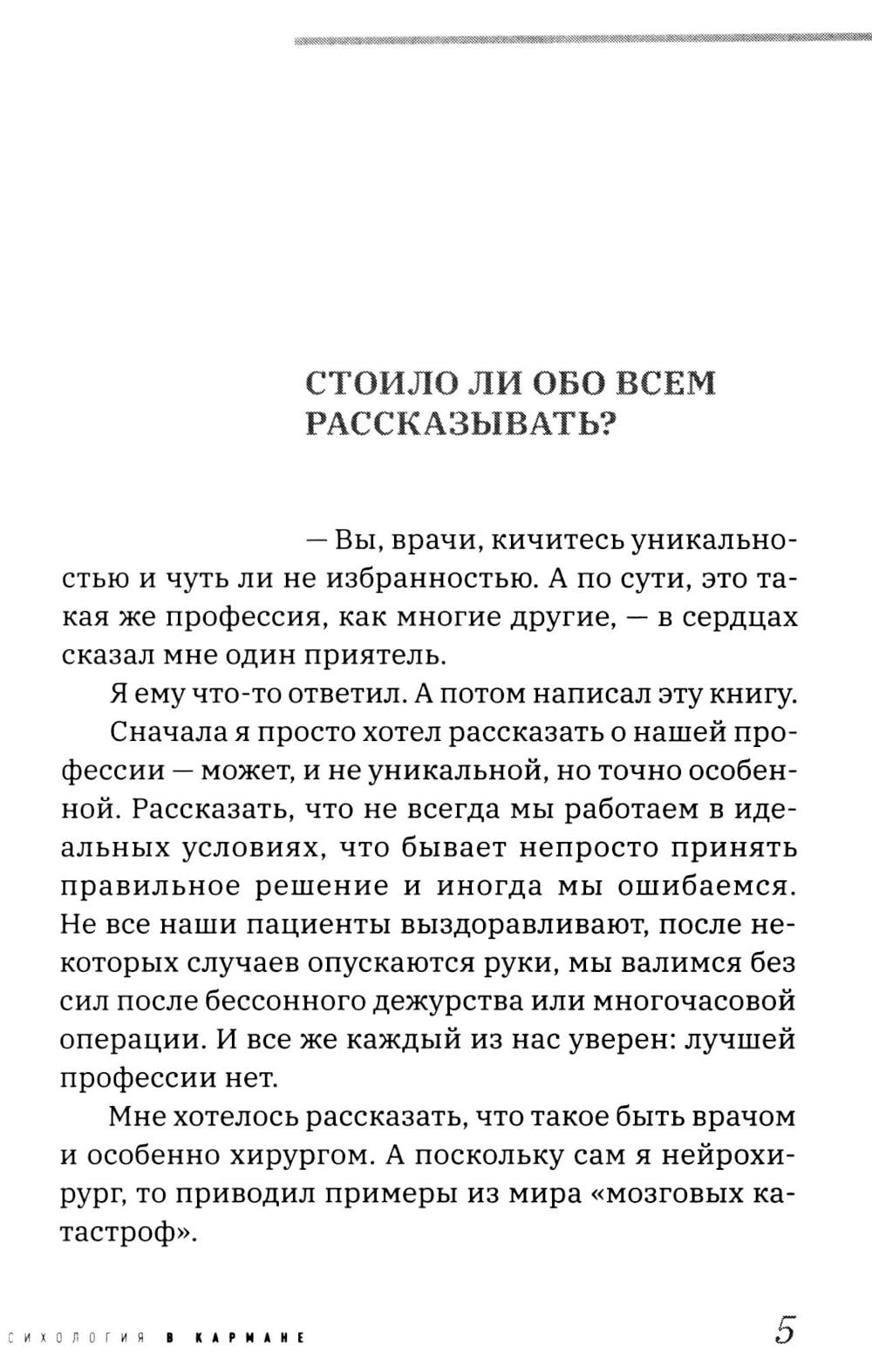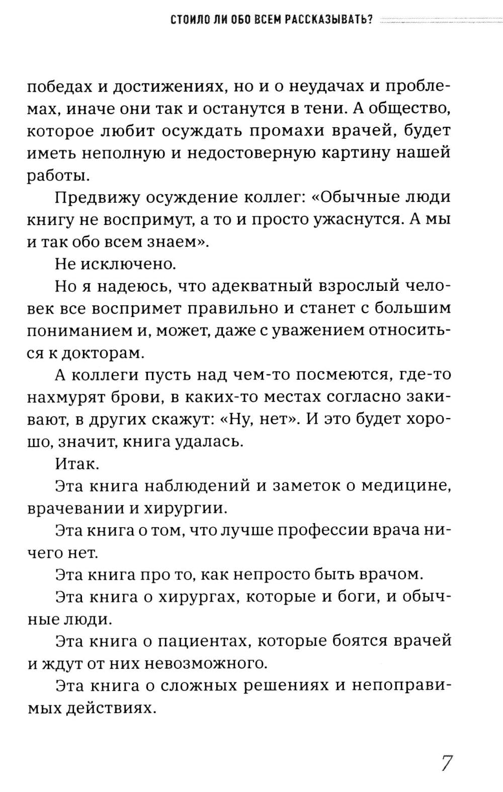 Это откровенная книга про врачей, в первую очередь про хирургов. О том, что не всегда мы работаем в идеальных условиях, что бывает непросто принять правильное решение, и иногда мы ошибаемся. Не все наши пациенты выздоравливают, после некоторых случаев опускаются руки, мы валимся без сил после бессонного дежурства или многочасовой операции. И все же каждый из нас уверен: лучшей профессии нет. Также эта книга о пациентах. О том, как они боятся врачей и в то же время ждут от них невозможного. Какими медицинскими мифами руководствуются и как часто поспешно судят о врачах. Как падают духом и проявляют истинный героизм. В книге раскрыто много того, о чем не принято говорить за пределами ординаторской. Пришлось приоткрыть «внутреннюю кухню» медицины в целом и хирургии в частности, для того чтобы общество, которое любит осуждать промахи врачей, имело более полную и достоверную картину того, как мы работаем.| Издательство | Городец |