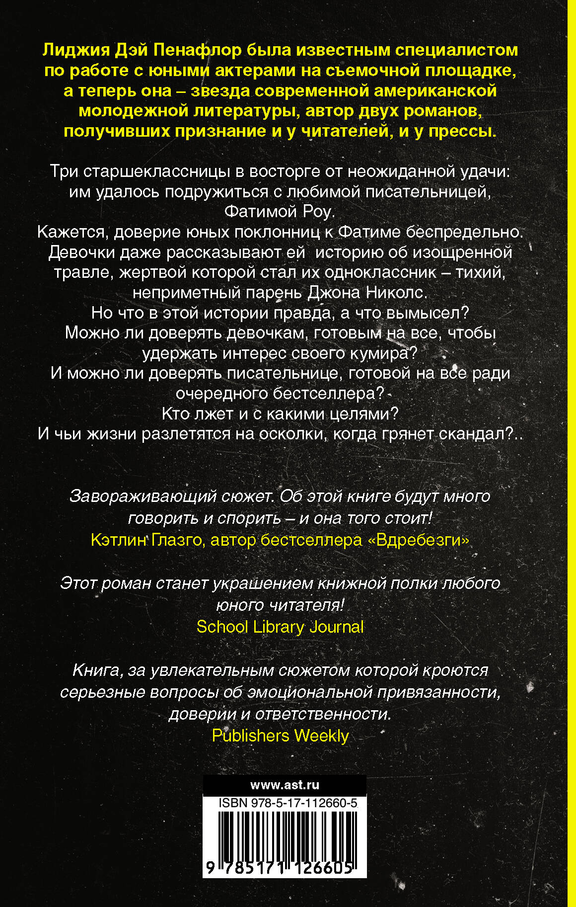 Три старшеклассницы в восторге от неожиданной удачи: им удалось подружиться с любимой писательницей, Фатимой Роу. Кажется, доверие юных поклонниц к Фатиме беспредельно. Девочки даже рассказывают ей историю об изощренной травле, жертвой которой стал их одноклассник - тихий, неприметный парень Джона Николс. Но что в этой истории правда, а что вымысел? Можно ли доверять девочкам, готовым на все, чтобы удержать интерес своего кумира? И можно ли доверять писательнице, готовой на все ради очередного бестселлера? Кто лжет, и с какими целями? И чьи жизни разлетятся на осколки, когда грянет скандал?..| Издательство | ИЗДАТЕЛЬСТВО "АСТ" |