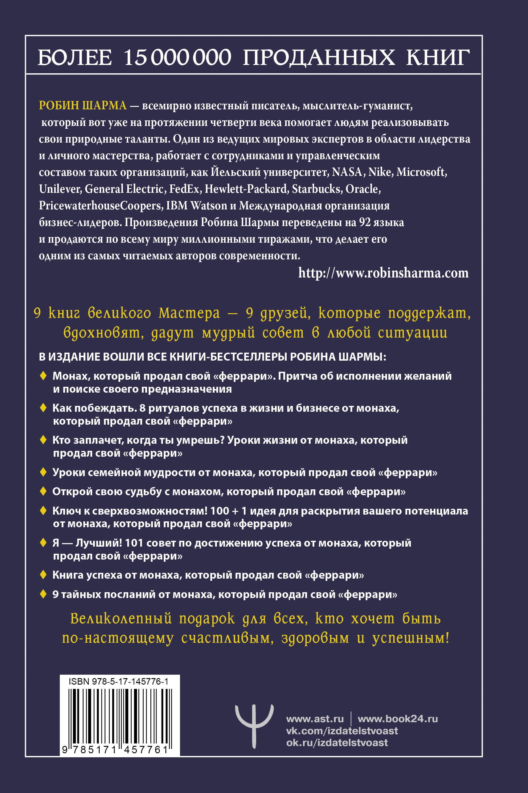 Робин Шарма - известный писатель, мыслитель-гуманист. Он входит в число ведущих консультантов по лидерству и личностной оптимизации. Его клиенты - знаменитые миллиардеры, деятели искусств, звезды профессионального спорта и многие компании из рейтинга "Fortune 100". Объединив западные технологии достижения успеха и максимальной работоспособности с восточной мудростью совершенствования разума, тела и духа, он помог миллионам людей по всему миру изменить жизнь. Под одной обложкой вы найдете все бестселлеры великого мотиватора и гуру личностного роста: • Монах, который продал свой "феррари". Притча об исполнении желаний и поиске своего предназначения • Как побеждать. 8 ритуалов успеха в жизни и бизнесе от монаха, который продал свой "феррари" • Кто заплачет, когда ты умрешь? Уроки жизни от монаха, который продал свой "феррари" • Уроки семейной мудрости от монаха, который продал свой "феррари" • Открой свою судьбу с монахом, который продал свой "феррари" • Ключ к сверхвозможностям! 100 + 1 идея для раскрытия вашего потенциала от монаха, который продал свой "феррари" • Я - Лучший! 101 совет по достижению успеха от монаха, который продал свой "феррари" • Книга успеха от монаха, который продал свой "феррари" • 9 тайных посланий от монаха, который продал свой "феррари" Это издание - великолепный подарок для всех, кто мечтает найти истинную мудрость и неисчерпаемый источник вдохновения, успеха, процветания, духовного роста.