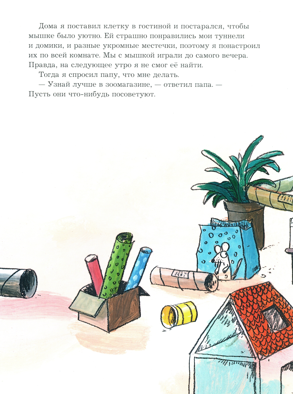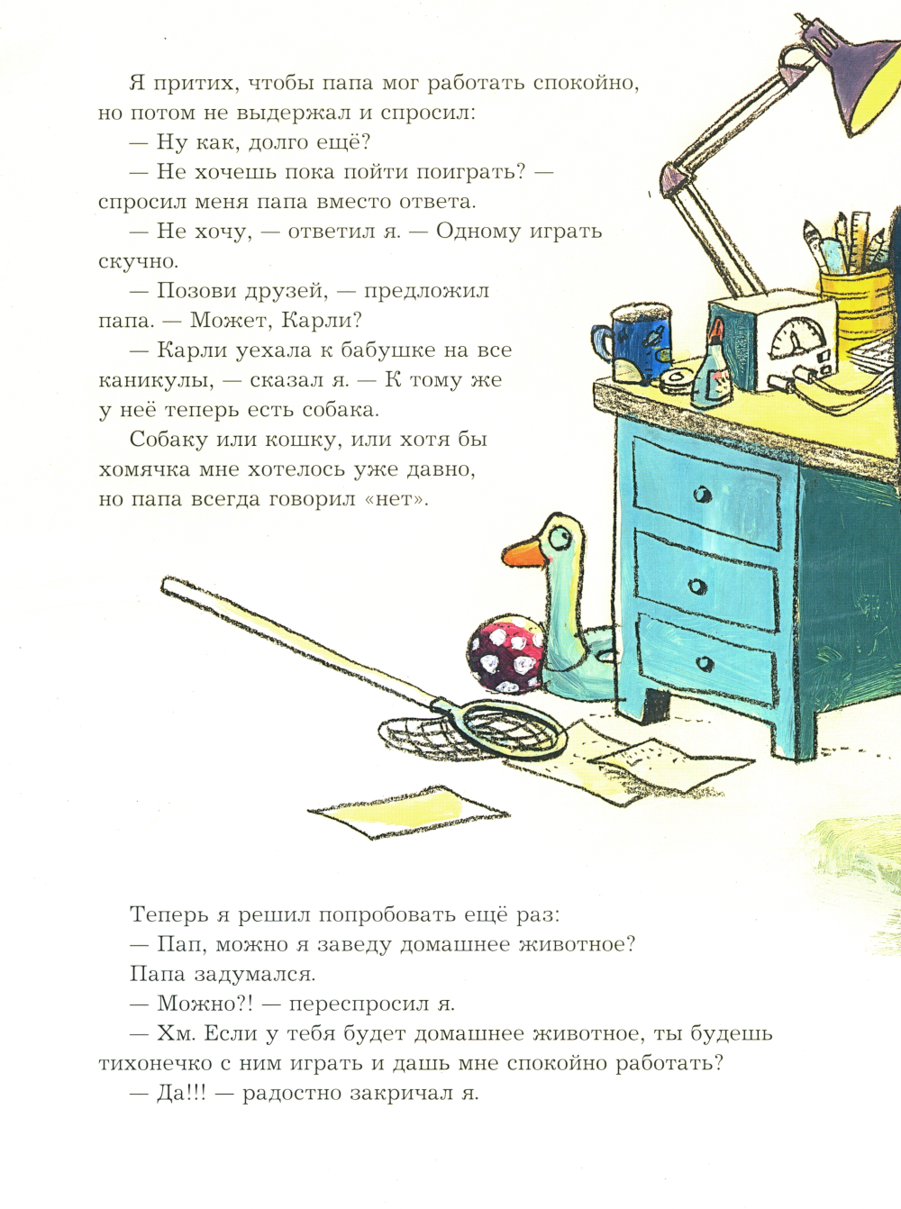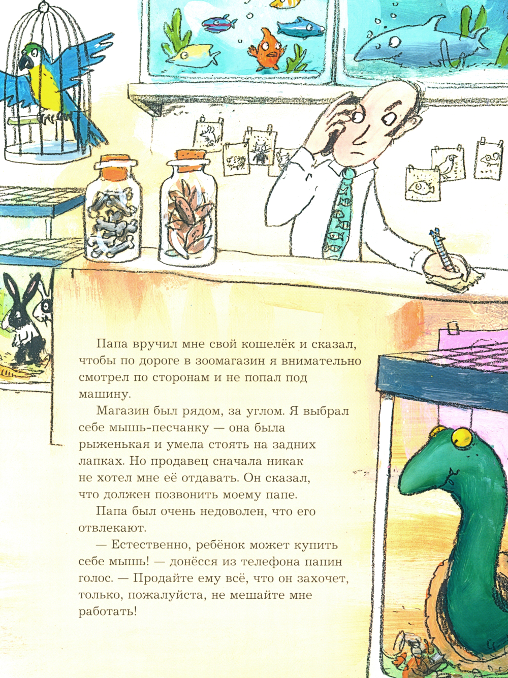 Папа очень занят: он работает над важным проектом. А поскольку работает он из дома, то просит своего сына Мику не отвлекать его. Но Мике скучно ? ведь он ребёнок и ему хочется с кем-то поиграть. Мика просит разрешения завести себе домашнее животное, чтобы было с кем провести время, пока папа занят. Немного подумав, папа даёт Мике своё согласие и кошелёк, с которым мальчик отправляется в зоомагазин. Там Мика покупает себе мышку-песчанку. И они отлично играют в прятки по всей гостиной. Правда, потом мышка прячется так хорошо, что Мика снова идёт в зоомагазин и на этот раз возвращается со щенком, потому что у собак отличный нюх, и они могут отыскать кого угодно. Ну а дальше… дальше Мике пришлось сбегать в зоомагазин ещё несколько раз. И вот, когда к воскресенью папа, наконец, закончил свой важный проект и огляделся по сторонам, он обнаружил, что за столом на кухне сидит и завтракает большая дружная компания: Мика с мышкой-песчанкой, щенок, тюлень, пингвин, попугай и слонёнок.
