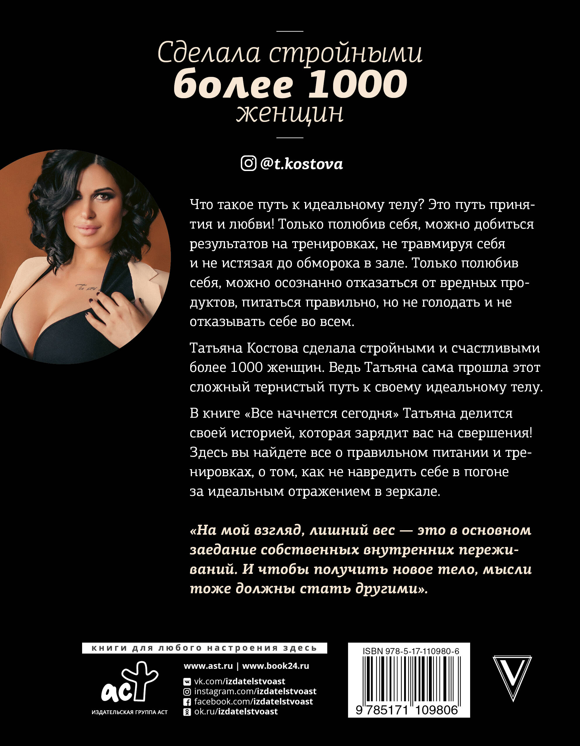 Татьяна Костова - супервумен, гениальный тренер и мама троих детей. Сама прошла весь путь от заедания до идеального тела. Помогла похудеть тысячам женщин - сделала их счастливыми. Вся самая важная информация о том, как наладить питание, начать тренироваться и полюбить себя. Только полюбив себя, вы можете стать красивой!| Издательство | ИЗДАТЕЛЬСТВО "АСТ" |