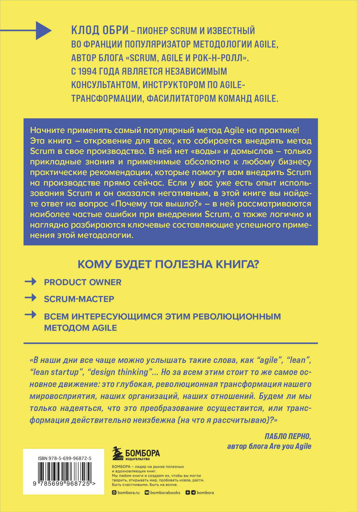 Одна из самых понятных и исчерпывающих книг-руководств по внедрению Scrum на производстве, проданная во всем мире тиражом свыше 20 000 экземпляров. В ней вы найдете целый пласт полезной и уникальной прикладной информации, с помощью которой без труда освоите эту востребованную методологию Agile и незамедлительно сможете применить ее на практике. Книга будет исключительно полезна читателям, выступающим в роли Product Owner или Scrum мастер, но и те, кто пока лишь интересуется Scrum, найдут в ней много нового. Клод Обри, известный французский энтузиаст Agile и пионер Scrum, рассматривает в своей книге такие вопросы, как: - Работа команды - люди, их роли и взаимодействие в экосистеме. - Бэклог - его структура и доработка. - Составляющие спринта - планирование, схватка, демо, ретро. - Прелюдия - краеугольный камень успешного старта работы. - Полезные дополнения к Scrum - планирование, индикаторы, инструменты, инженерия. - Пути внедрения Scrum в организации. Технология Scrum с каждым годом получает все большее распространение и постоянно меняется, подстраиваясь под вызовы и потребности сегодняшнего дня. Будьте гибкими, используйте Scrum и повышайте эффективность своей команды при помощи этого издания!| Издательство | ООО "Издательство "Эксмо" |