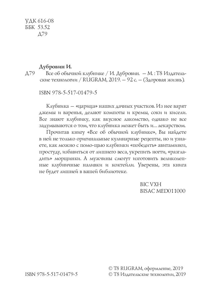 Клубника - «царица» наших дачных участков. Из нее варят джемы и варенья, делают компоты и кремы, соки и кисели. Все знают клубнику, как вкусное лакомство, однако не все задумываются о том, что клубника может быть и... лекарством. Прочитав книгу «Все об обычной клубнике», Вы найдете в ней не только оригинальные кулинарные рецепты, но и узнаете, как можно с помощью клубники «победить» авитаминоз, простуду, избавиться от лишнего веса, укрепить ногти, «разгладить» морщинки. А мужчины смогут изготовить великолепные клубничные наливки и коктейли. Уверены, эта книга не будет лишней в вашей библиотеке.| Издательство | Т8 RUGRAM |