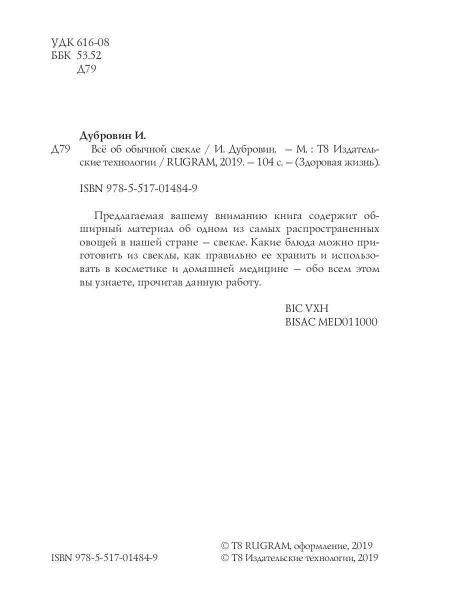 Предлагаемая вашему вниманию книга содержит обширный материал об одном из самых распространенных овощей в нашей стране - свекле. Какие блюда можно приготовить из свеклы, как правильно ее хранить и использовать в косметике и домашней медицине - обо всем этом вы узнаете, прочитав данную работу.| Издательство | Т8 RUGRAM |