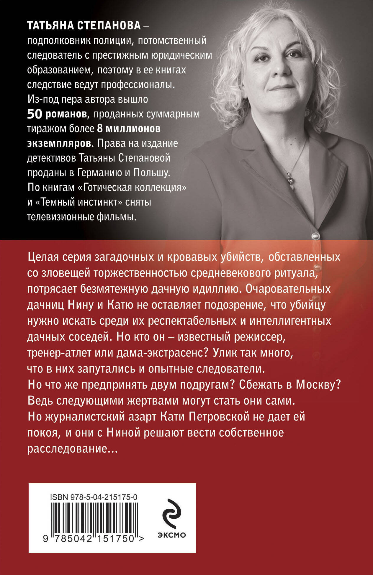 Целая серия загадочных и кровавых убийств, обставленных со зловещей торжественностью средневекового ритуала, потрясает безмятежную дачную идиллию. Очаровательных дачниц Нину и Катю не оставляет подозрение, что убийцу нужно искать среди их респектабельных и интеллигентных дачных соседей. Но кто он - известный режиссер, тренер-атлет или дама-экстрасенс? Улик так много, что в них запутались и опытные следователи. Но что же предпринять двум подругам? Сбежать в Москву? Ведь следующими жертвами могут стать они сами. Но журналистский азарт Кати Петровской не дает ей покоя, и они с Ниной решают вести собственное расследование... Романы потомственного следователя Татьяны Степановой позволяют читателю побывать в литературной «комнате страха». Таинственные убийства, почти осязаемая атмосфера преступления, томительное и тревожное ожидание чего-то неведомого, пугающего... Все это Татьяне Степановой удается воспроизвести просто блестяще. Случайные встречи, повседневные дела, незначительные детали изображаются в ее детективах в каком-то особом, драматическом свете, словно безобидный весенний луг перед стремительно надвигающейся грозой.| Издательство | ООО "Издательство "Эксмо" |