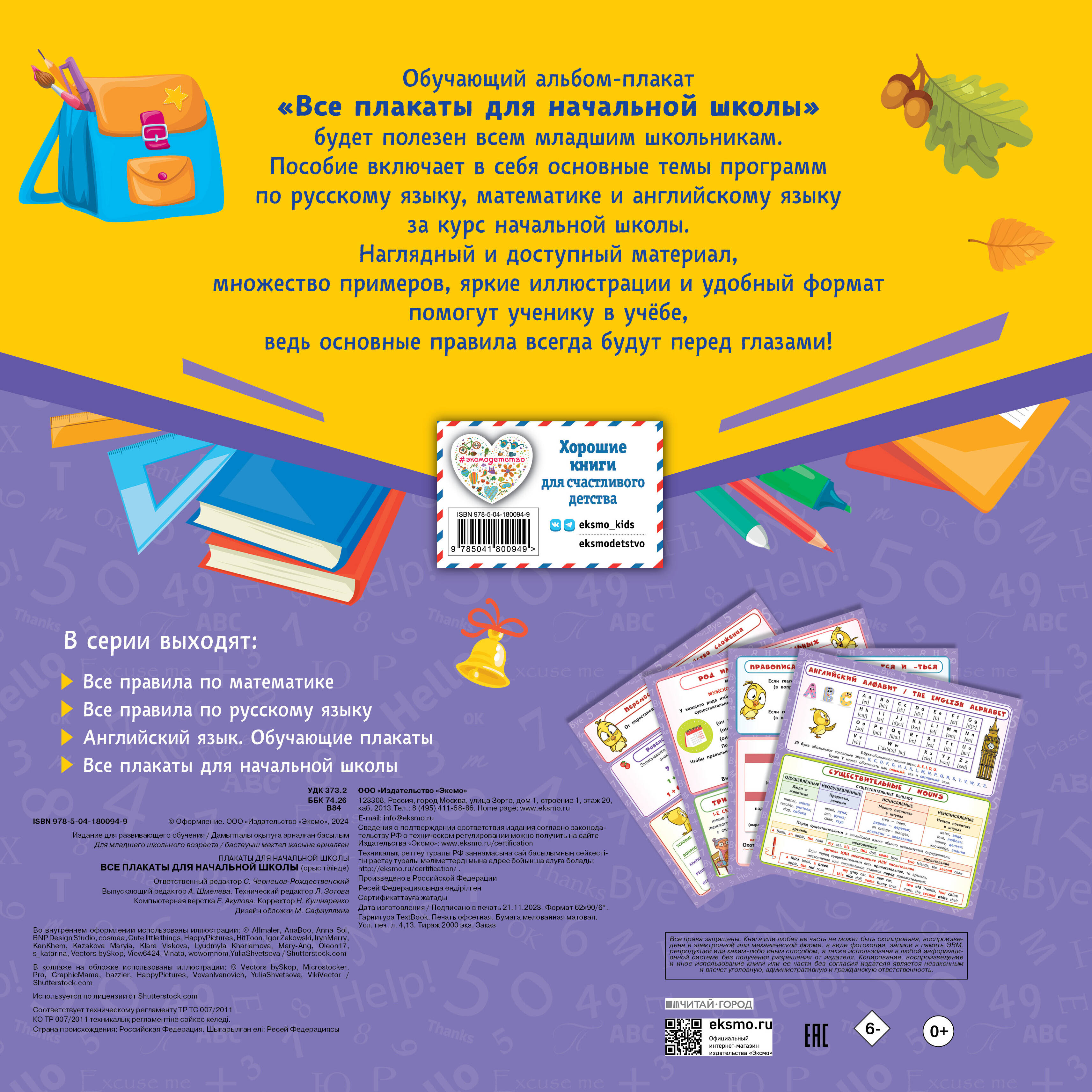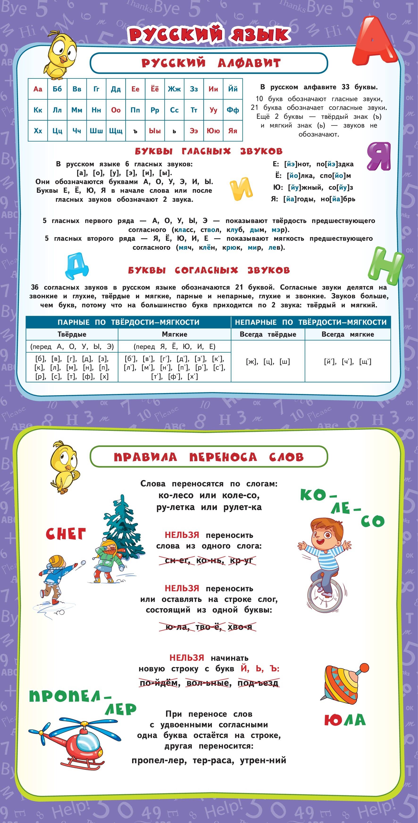В пособии под одной обложкой собраны все основные правила по русскому языку, математике и английскому языку за курс начальной школы. Основная цель альбома-плаката - повторение и закрепление знаний, полученных на уроках в 1-4 классах. Учебный материал изложен наглядно и доступно, с применением схем и таблиц, и красочно проиллюстрирован. Благодаря этому правила и примеры их применения будут легко запоминаться. Порядок тем соответствует школьной программе. Плакаты можно использовать как дома, так и в школе для лучшего усвоения и повторения учебного материала.| Издательство | ООО "Издательство "Эксмо" |