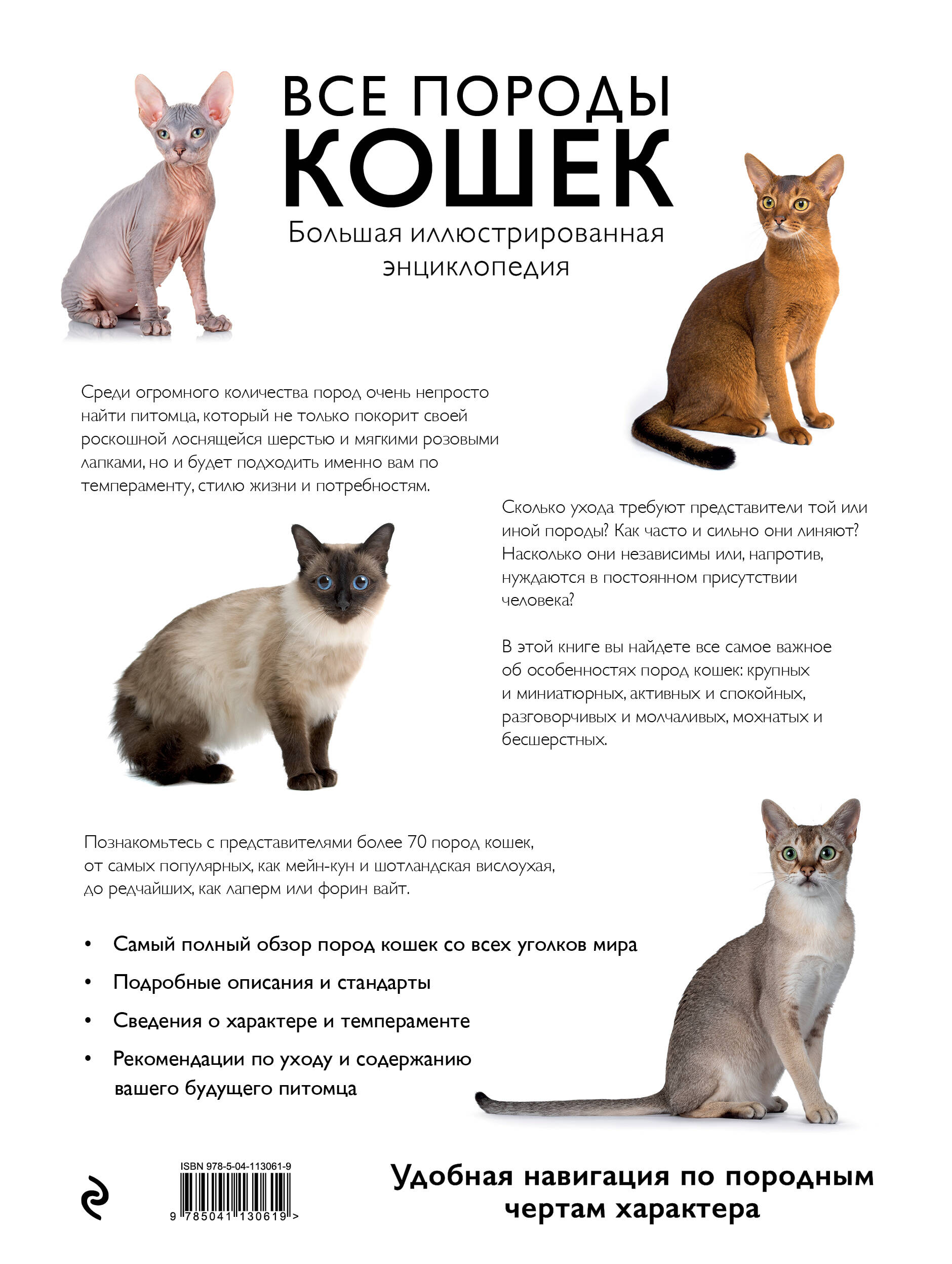 Любой котенок - милейшее создание, мимо которого сложно пройти. Но как правильно выбрать себе пушистого друга, не только по одной внешности? Ведь все породы разные, и важно подобрать питомца, который будет подходить именно вам по темпераменту, стилю жизни и потребностям. Живете один или у вас большая семья с детьми? Часто путешествуете или любите больше времени проводить дома? Хотите кота с независимым характером или, наоборот, любящего проводить как можно больше времени рядом с людьми? Сколько времени готовы уделять уходу за шерстью? В этой энциклопедии вы найдете более 70 самых разных пород кошек: крупных и миниатюрных, активных и спокойных, мохнатых и короткошерстных и познакомитесь с представителя как самых популярных пород, как мейн-кун или шотландская вислоухая, так и редчайших, как лаперм или форин вайт. - Самый полный обзор популярных пород кошек со всех уголков мира. - Подробные описания и стандарты. - Сведения о характере и темпераменте. - Рекомендации по уходу и содержанию вашего будущего питомца.| Издательство | ООО "Издательство "Эксмо" |