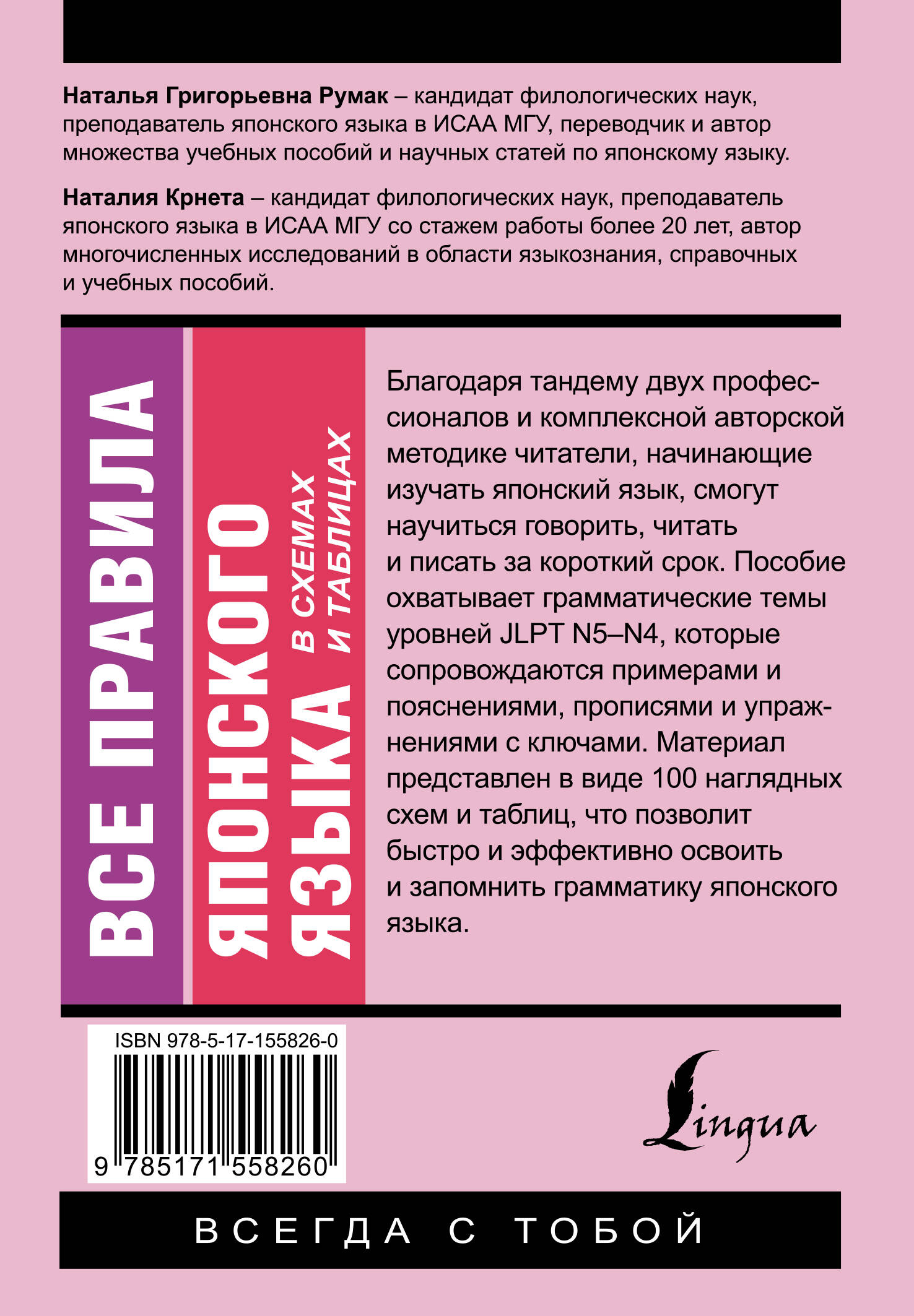 Наталья Григорьевна Румак - преподаватель японского языка в ИСАА МГУ, кандидат филологических наук, переводчик художественной литературы и автор множества учебных пособий и научных статей по японскому языку. Наталия Крнета - преподаватель японского языка в ИСАА МГУ со стажем работы более 20 лет, кандидат филологических наук, автор многочисленных исследований в области языкознания, справочных и учебных пособий. Издание содержит полный объём грамматики японского языка, необходимый для освоения начальных уровней JLPT N5-N4. Материал представлен в виде 100 наглядных схем и таблиц, что помогает быстро и эффективно его усвоить и систематизировать. Грамматические темы сопровождаются примерами и пояснениями, прописями и упражнениями с ключами. Пособие предназначено для всех, кто изучает японский язык или желает улучшить владение японской грамматикой.| Издательство | ИЗДАТЕЛЬСТВО "АСТ" |