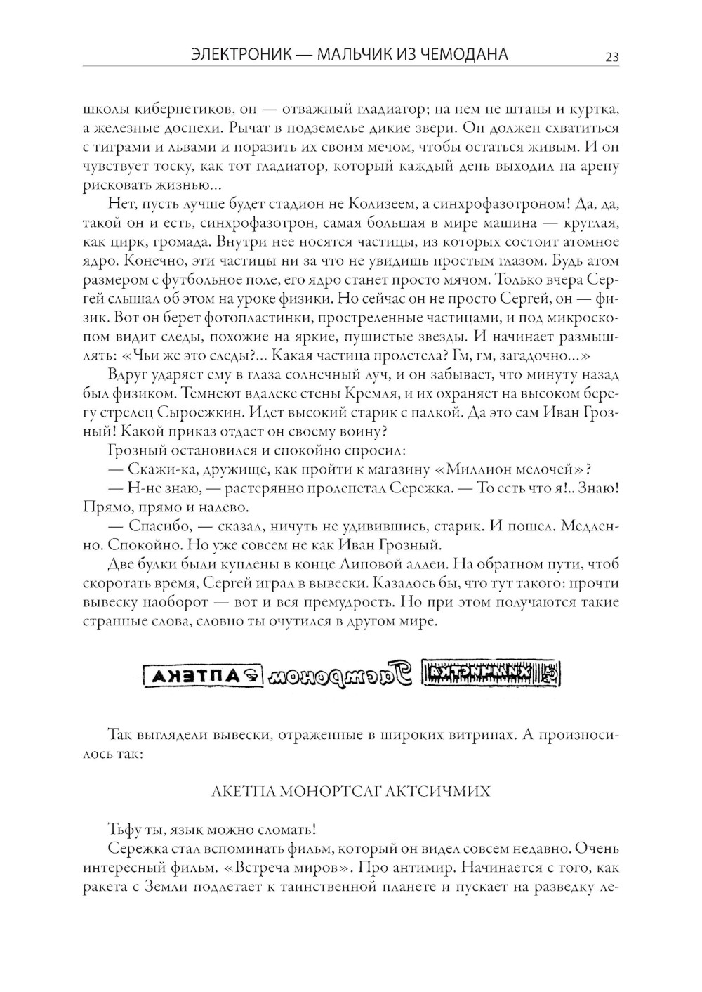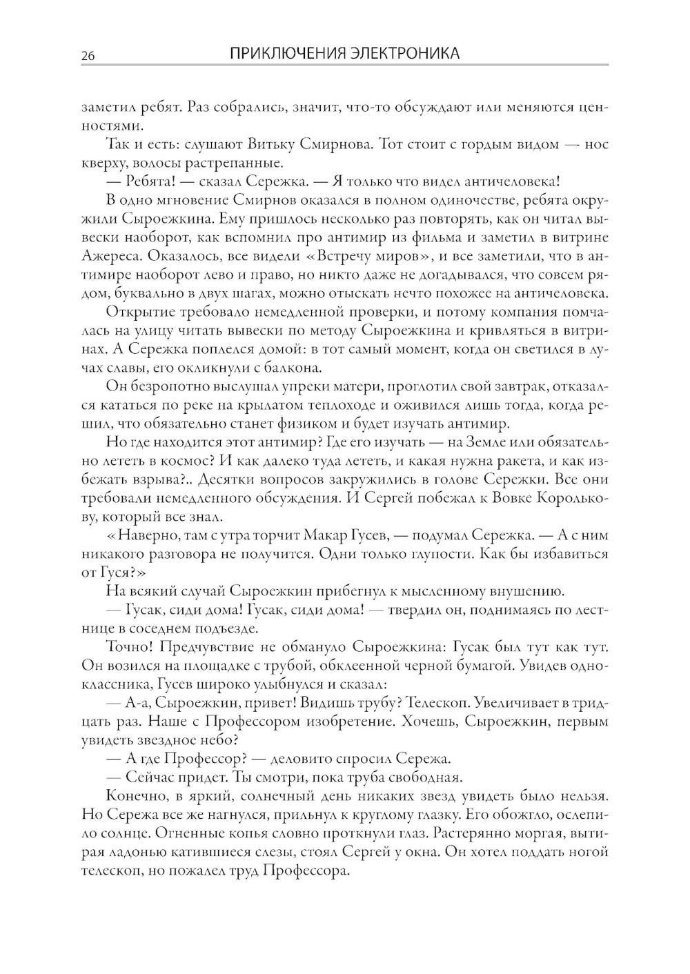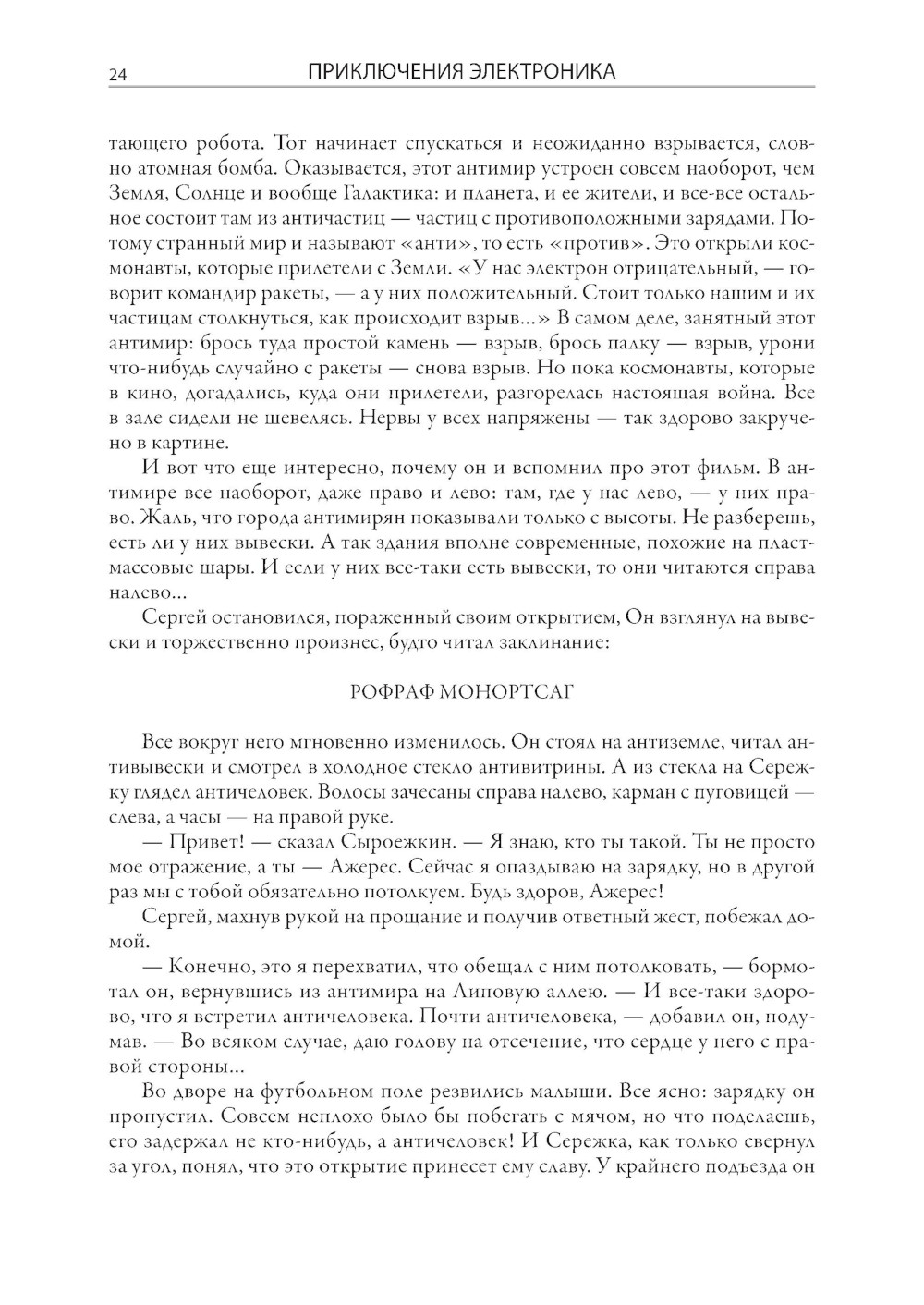 Журналист по образованию Евгений Серафимович Велтистов смог занять в отечественной литературе второй половины XX века совершенно особое место. Одним из первых он начал писать фантастические повести для детей. Первое его сочинение в таком жанре - «Приключения на дне моря» - было опубликовано в 1960 году. Четыре года спустя Велтистов выпустил новую книгу, в которой обыгрывался прием двойников, эффектно разыгранный Марком Твеном в «Принце и нищем». Только у Евгения Серафимовича в соответствии с духом времени один герой стал бойким советским мальчишкой, а второй, как две капли на него похожий, - роботом! Такой прием, помноженный на литературный талант Велтистова, сработал, и со временем истории про приключения Электроника вылились в целую серию повестей. Все они собраны под одной обложкой в этом издании. Евгений Серафимович писал фантастику и для взрослых. Его перу принадлежат повесть «Глоток Солнца. Записки программиста Марта Снегова» и роман «Ноктюрн пустоты», однако именно приключения электронного мальчика стали своеобразной визитной карточкой писателя, который начал разрабатывать тему андроидов задолго до начала эры искусственного интеллекта. Причем делал он это легко, увлекательно, с юмором. В этом и кроется непреходящий интерес читателей самого разного возраста к приключениям Электроника. Рисунки в этой книге выполнены Евгением Тихоновичем Мигуновым. Главная их отличительная черта - необычайный динамизм и выразительность. Нарисованные художником персонажи почти всегда изображены в движении, и это неслучайно, ведь Евгений Тихонович много лет проработал в анимационном кино. В 1939 г. он поступил на художественный факультет Всероссийского государственного института кинематографии, где начал заниматься в мастерской под руководством знаменитого Иванова-Вано. Окончив ВГИК, Мигунов стал не обычным художником-мультипликатором, а настоящим новатором рисованного и кукольного кино. Его творческие наработки сыграли важную роль в становлении современной школы русской мультипликации. Мигунов придумывал новые приемы, патентовал изобретения, помогавшие оживлять кукол, предлагал новые режиссерские приемы. С 1961 г. Евгений Тихонович начал сотрудничать с журналами «Мурзилка», «Веселые картинки», «Пионер», «Крокодил», делая для них многочисленные иллюстрации. В 1965 г. именно с его рисунками вышла ставшая знаменитой повесть братьев Стругацких «Понедельник начинается в субботу». По манере и технике они были очень похожи на его иллюстрации к повестям Велтистова, которые украшают эту книгу.