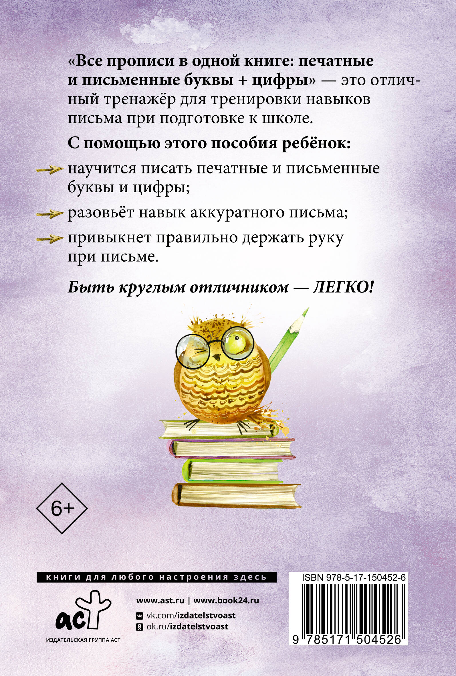 Аннотация: Все прописи в одной книге: печатные и письменные буквы + цифры