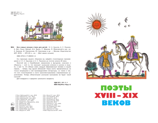 Золотой век и Серебряный, имажинизм и футуризм, классики и обэриуты - всё то, что проходят нынешние ученики в школах и лицеях, и всё то, что обязан знать каждый образованный человек в нашей стране, - теперь под одной обложкой! Наша книга примечательна не только входящими в неё произведениями литературы, но также и тем, что все стихотворения в книге проиллюстрированы современными художниками. Теперь обязательная школьная программа не будет такой скучной! Для среднего школьного возраста.