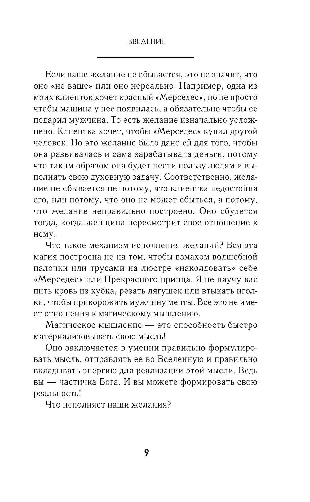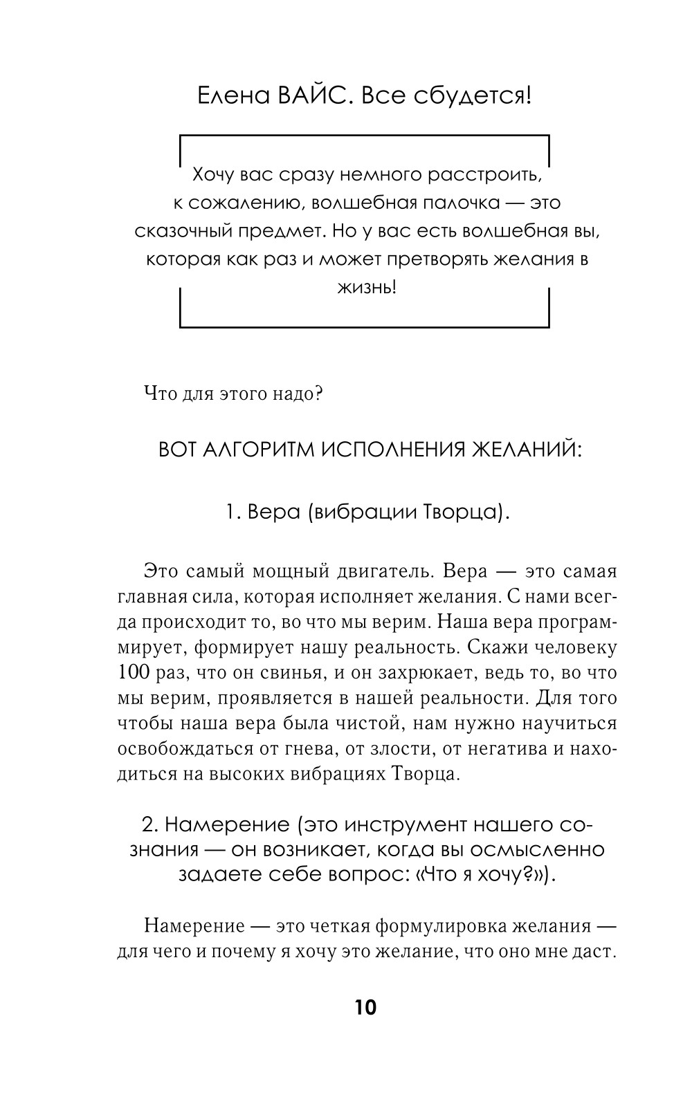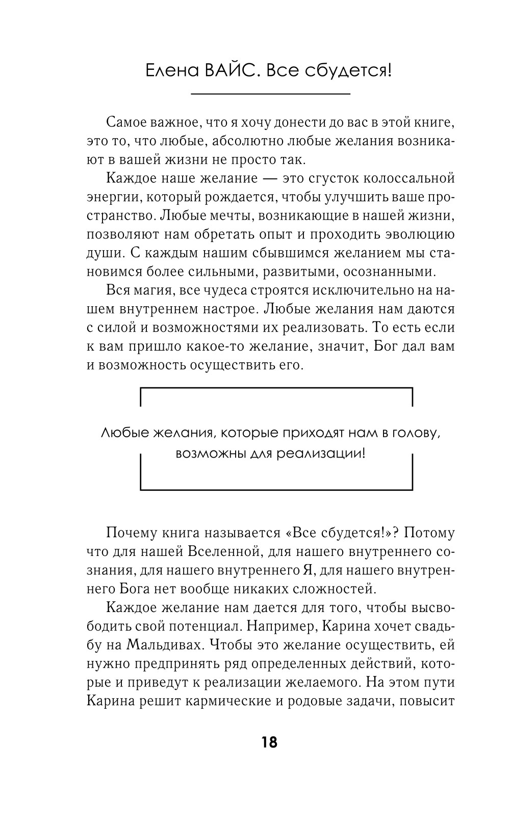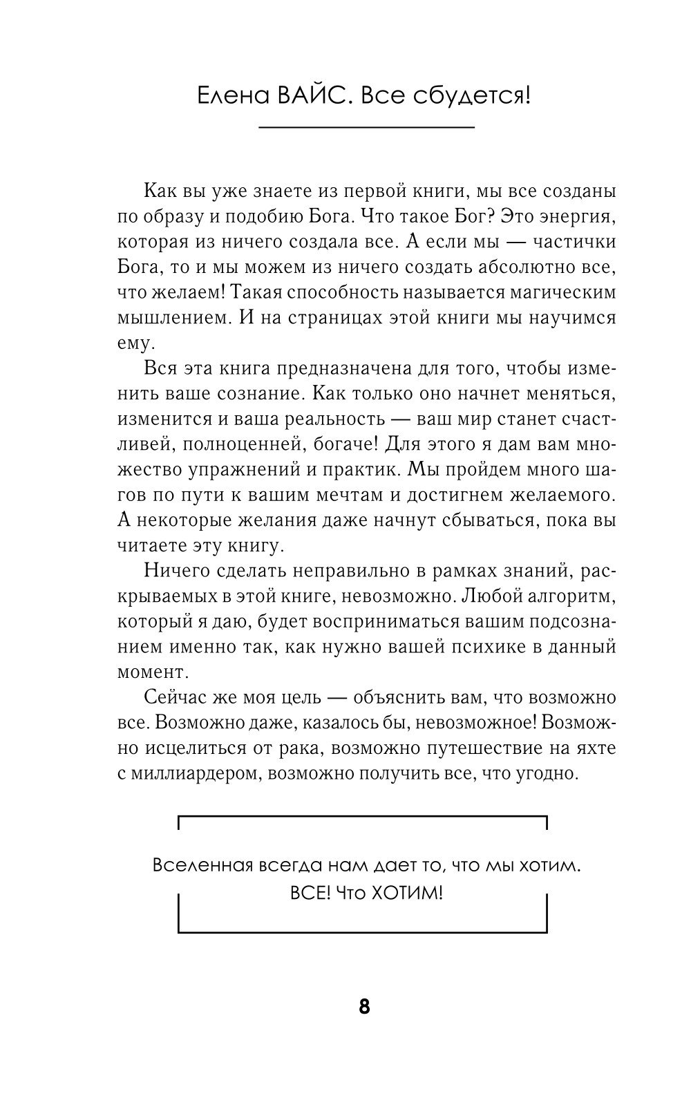 Как правильно мечтать? Как загадать желание, чтобы оно исполнилось? Что блокирует исполнение желаний? На эти и другие вопросы Елена Вайс - практикующий клинический психолог и немного волшебница - отвечает в своей книге, предлагая читателям уникальные практики и упражнения. Что такое механизм исполнения желаний? Вся эта магия построена не на том, чтобы взмахом волшебной палочки «наколдовать» себе прекрасного принца. Все это не имеет отношения к магическому мышлению. Магическое мышление - это способность быстро материализовывать свою мысль! Оно заключается в умении правильно формулировать, отправлять запрос во Вселенную и правильно вкладывать энергию для реализации этой мысли. Ведь вы - частичка Бога. И вы можете формировать свою реальность! Эта книга предназначена для того, чтобы изменить сознание. Как только оно начнет меняться, изменится и реальность - мир станет счастливей, полноценней, богаче!| Издательство | Эксмо |
