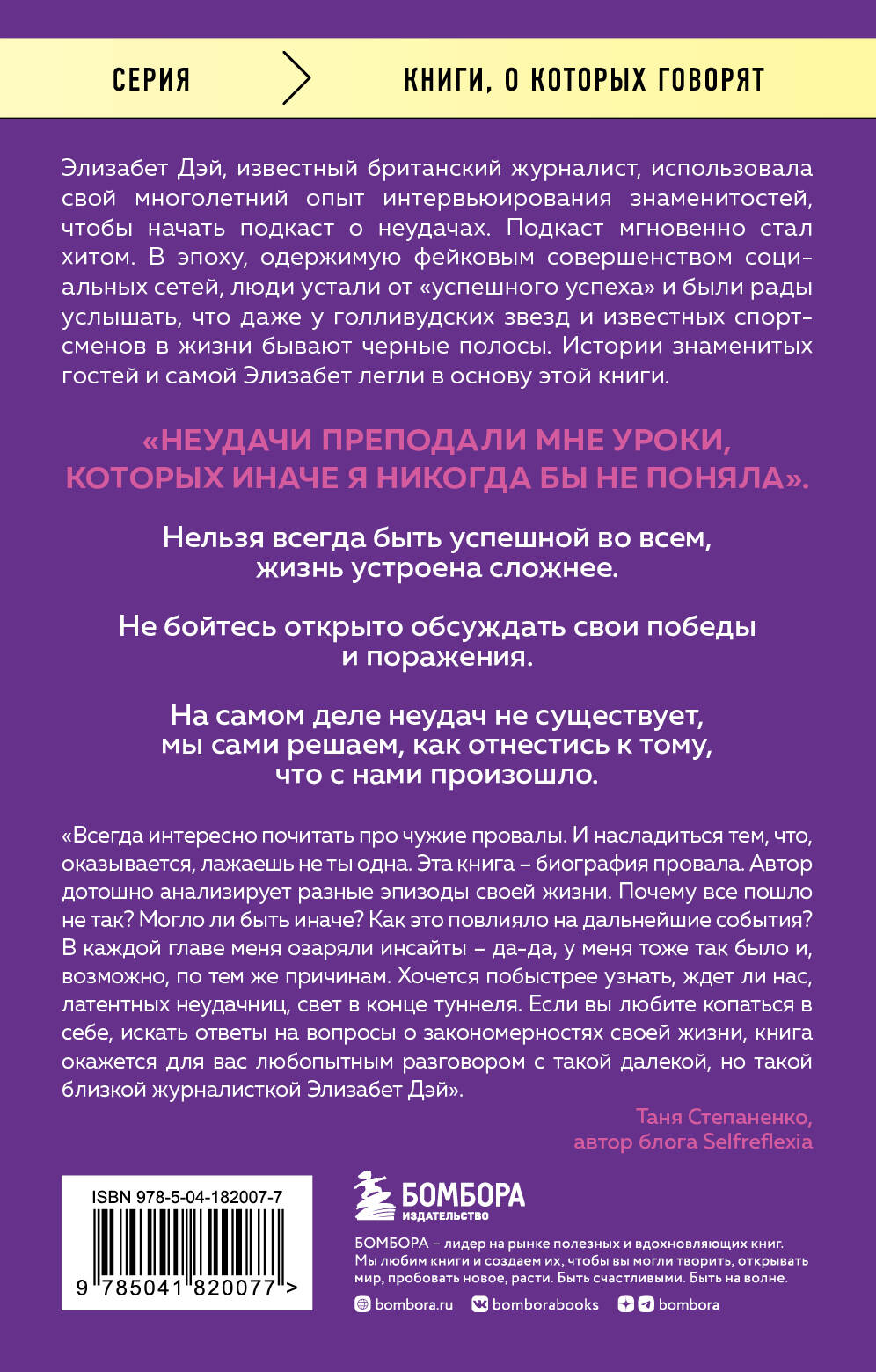 Знакомьтесь, это Элизабет Дэй, ей немного за сорок. Она известная журналистка, талантливая писательница и автор одного из самых популярных подкастов Великобритании «How to Fail». Звучит отлично, но всего пару лет назад Элизабет пережила болезненный развод, после нескольких лет лечения попрощалась с мечтой стать матерью и бросила успешную карьеру ради туманных перспектив. Жизнь любого человека - это череда взлетов и падений. Касается ли это поиска друзей в новой школе или интернет-знакомств, жизнь вносит свои коррективы. Вселяя надежду, вдохновляя и используя множество примеров из жизни, Элизабет показывает, что мы больше, чем наши неудачи. Наши промахи делают нас сильнее и дают толчок для роста. Эта книга - наполовину мемуары, наполовину манифест, которая призывает стать сильными и счастливыми и не бояться жизни! Вы узнаете, как: - прожить месяц в России 90-х, будучи тринадцатилетней англичанкой; - какое-то время вести роскошный образ жизни, ориентируясь на Гвинет Пэлтроу; - успешно (и не очень) искать идеального партнера в интернете и в реальном мире; - пережить несколько выкидышей и не сойти с ума от многочисленных советчиков; - благодаря невероятной случайности поговорить по душам с Робертом Паттинсоном.| Издательство | ООО "Издательство "Эксмо" |