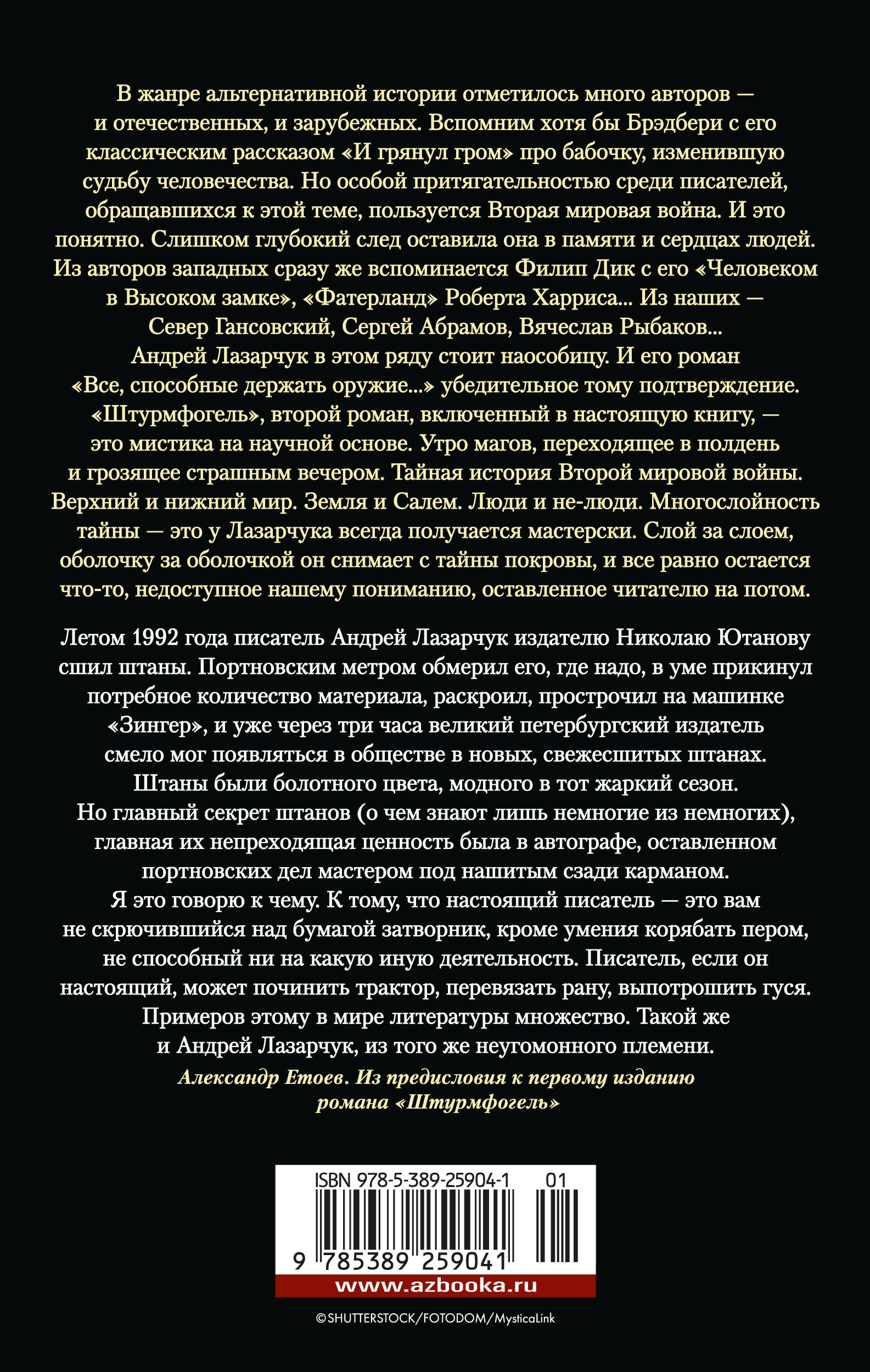 В жанре альтернативной истории отметилось много авторов - и отечественных, и зарубежных. Вспомним хотя бы Брэдбери с его классическим рассказом "И грянул гром" про бабочку, изменившую судьбу человечества. Но особой притягательностью среди писателей, обращавшихся к этой теме, пользуется Вторая мировая война. И это понятно. Слишком глубокий след оставила она в памяти и сердцах людей. Из авторов западных сразу же вспоминается Филип Дик с его "Человеком в Высоком замке", "Фатерланд" Роберта Харриса… Из наших - Север Гансовский, Сергей Абрамов, Вячеслав Рыбаков… Андрей Лазарчук в этом ряду стоит наособицу. И его роман "Все, способные держать оружие…" убедительное тому подтверждение. "Штурмфогель", второй роман, включенный в настоящую книгу, это мистика на научной основе. Утро магов, переходящее в полдень и грозящее страшным вечером. Тайная история Второй мировой войны. Верхний и нижний мир. Земля и Салем. Люди и не-люди. Многослойность тайны - это у Лазарчука всегда получается мастерски. Слой за слоем, оболочку за оболочкой он снимает с тайны покровы, и все равно остается что-то, недоступное нашему пониманию, оставленное читателю на потом.| Издательство | Азбука-Аттикус Издат.группа ООО |