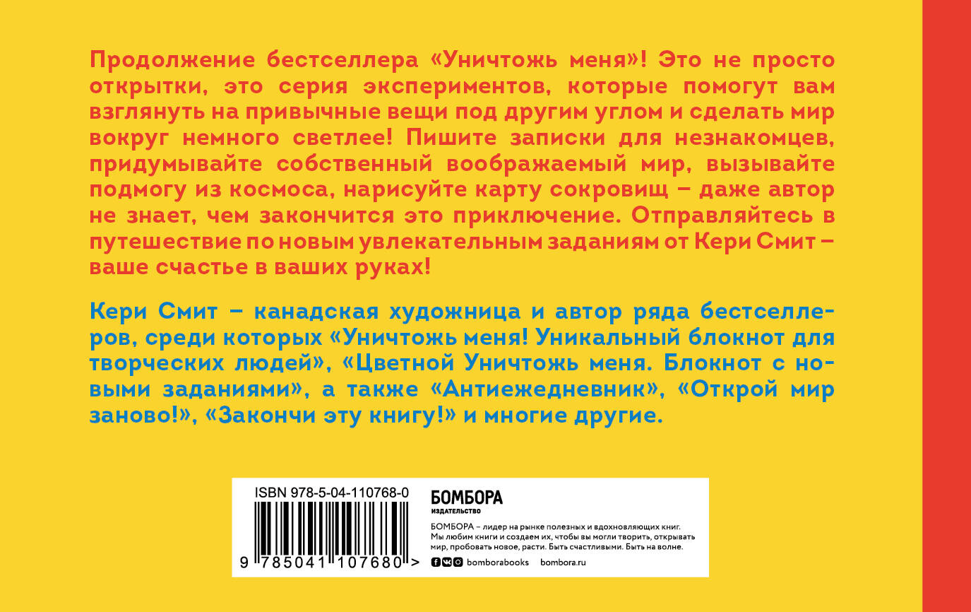 Продолжение бестселлера "Уничтожь меня"! Набор открыток с заданиями, которые помогут вам переосмыслить мир вокруг и найти радость даже в непростые времена! Пишите записки для незнакомцев, придумывайте собственный воображаемый мир, вызывайте подмогу из космоса, нарисуйте карту сокровищ - экспериментируйте и смотрите, куда это приведет. Каждая открытка легко вырывается из блока - просто выберите ту, что нравится больше всего, и вперед! Не бойтесь пробовать новое - делайте мир вокруг себя лучше!| Издательство | ООО "Издательство "Эксмо" |