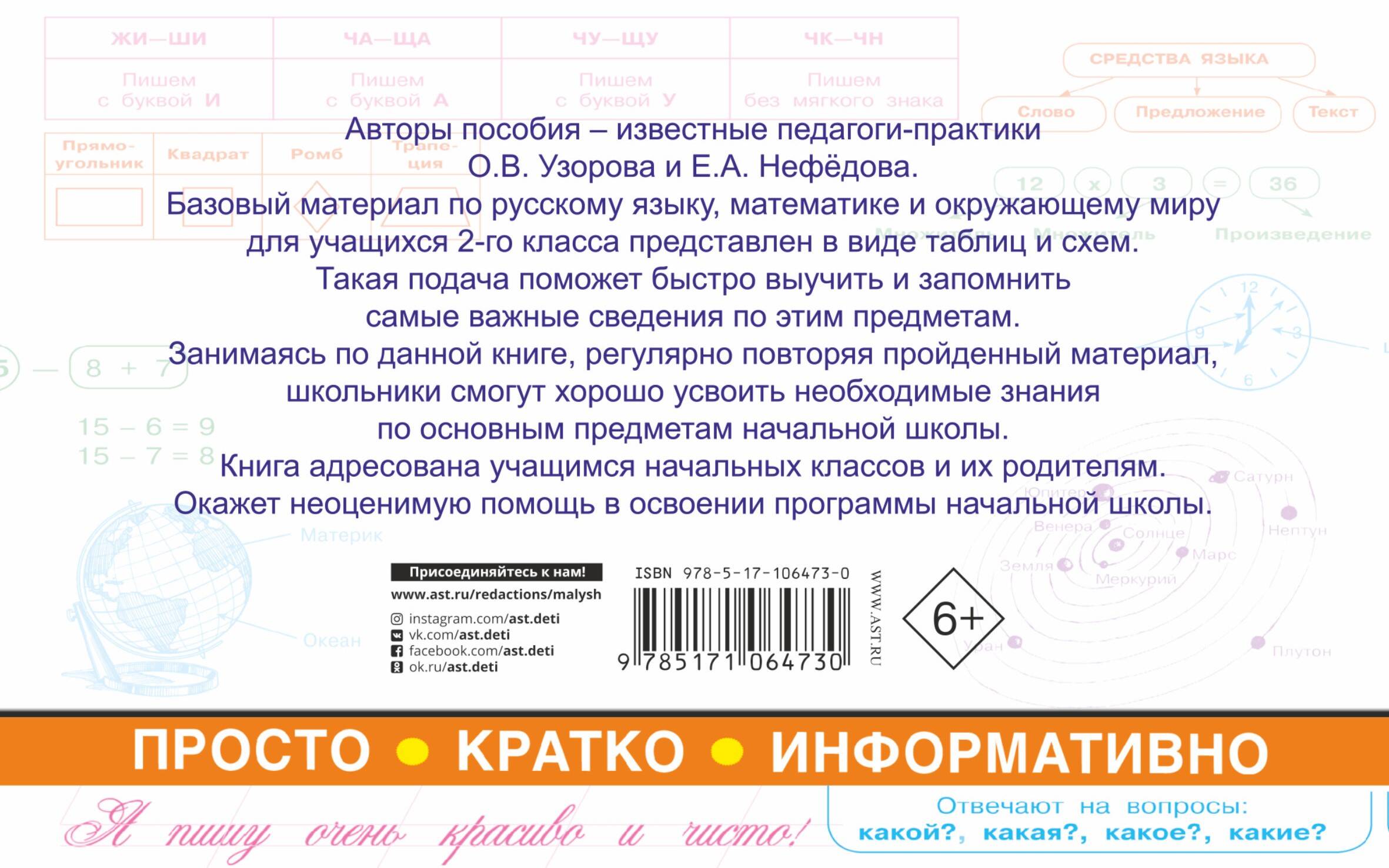 О чем эта книга Учебное пособие известных педагогов-практиков О. В. Узоровой и Е. А. Нефёдовой включает схемы и таблицы по русскому языку, математике и окружающему миру. Такая подача материала поможет школьникам быстро выучить и запомнить самые важные сведения по этим предметам. Кому эта книга будет интересна Школьникам начальных классов и их родителям. Каковы особенности этой книги • Весь материал представлен в виде таблиц и схем. • Регулярные повторения пройденного материала помогут школьнику усвоить необходимые знания по основным предметам. Книга адресована учащимся начальных классов и окажет неоценимую помощь в освоении программы начальной школы.| Издательство | ИЗДАТЕЛЬСТВО "АСТ" |