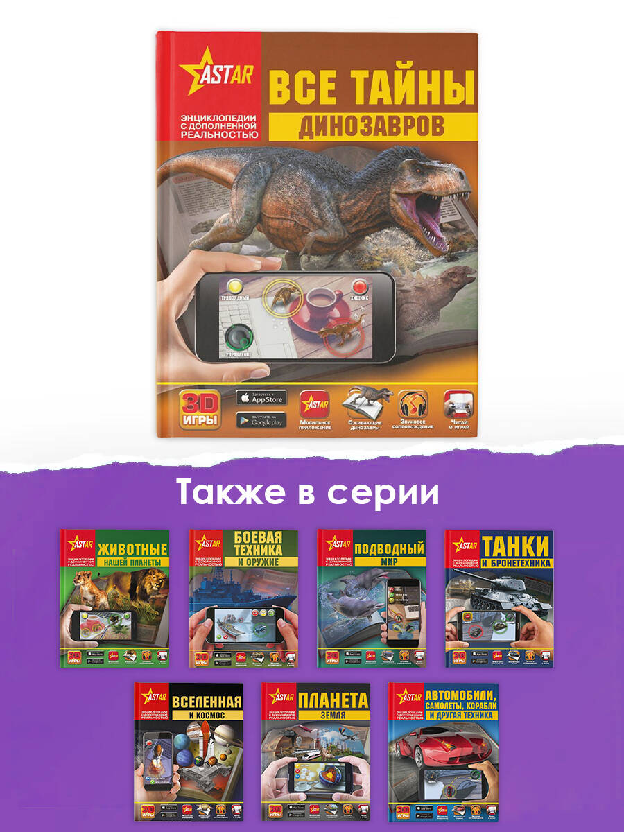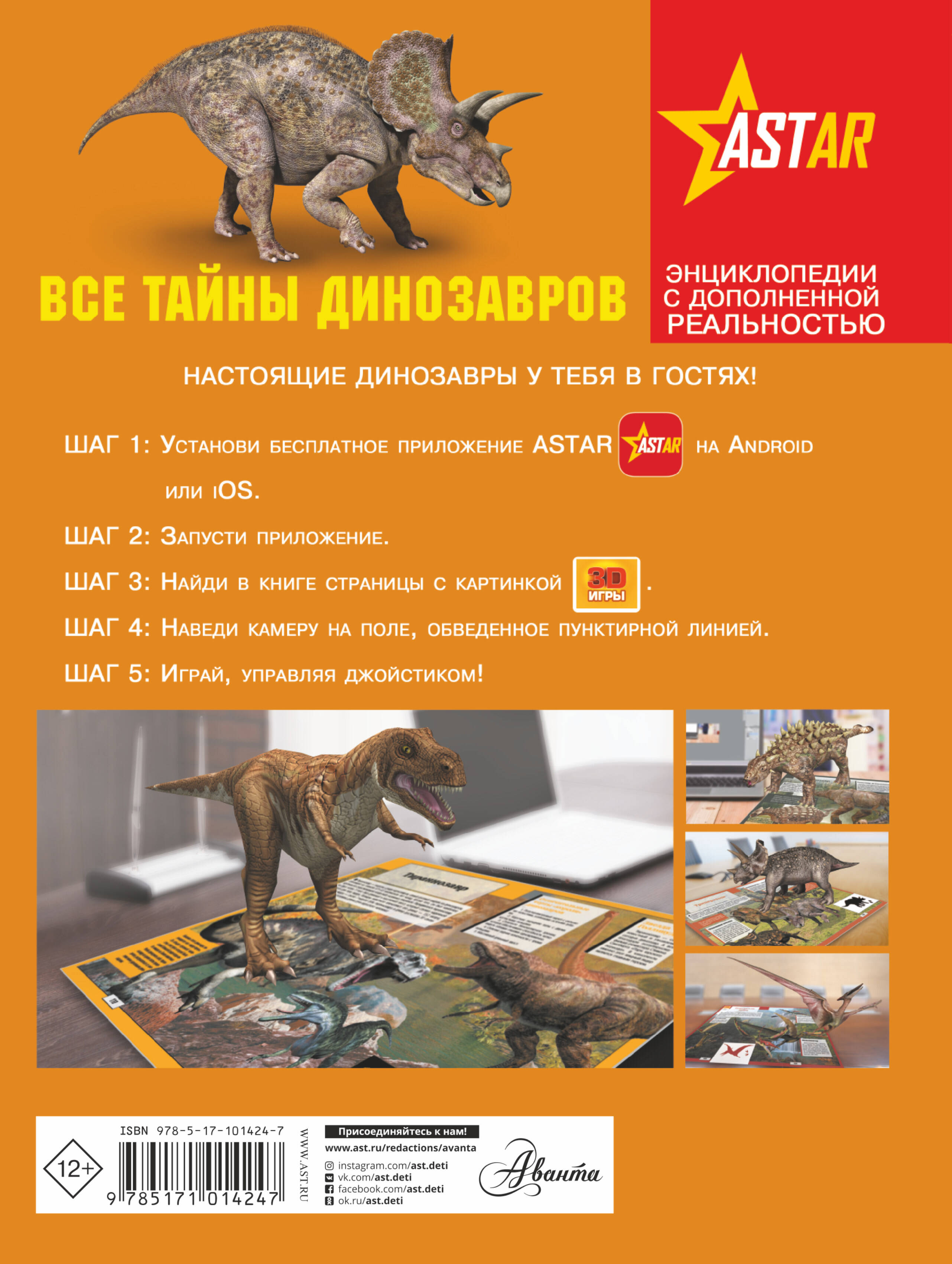 Перед вами не обычная энциклопедия: это - книга с дополненной реальностью в формате интерактивных 3D-игр. Это означает, что у вас появилась уникальная возможность не только познакомиться с динозаврами - доисторическими животными нашей планеты, - читая их описание и рассматривая иллюстрации, но и увидеть этих загадочных ящеров в движении и объеме. Но следует соблюдать осторожность: некоторые из них могут быть действительно опасны. Как же это возможно? Всё просто: возьмите смартфон или планшет, загрузите бесплатное мобильное приложение, установите его, наведите устройство на страницу из книги с таким значком 3D-игры - и перед вами откроются небывалые возможности дополненной реальности! По вашему желанию птеродактиль начнет перелетать с дерева на дерево, смышленый велоцираптор отправится на охоту и даже попытается укусить вас, а трицератопс на ваших глазах порвет своим рогом страницу этой книги. И, наконец, главное: теперь у вас есть уникальная возможность сделать фото на память с самим королем динозавров - тираннозавром. И всем этим будете управлять вы сами!| Издательство | ИЗДАТЕЛЬСТВО "АСТ" |