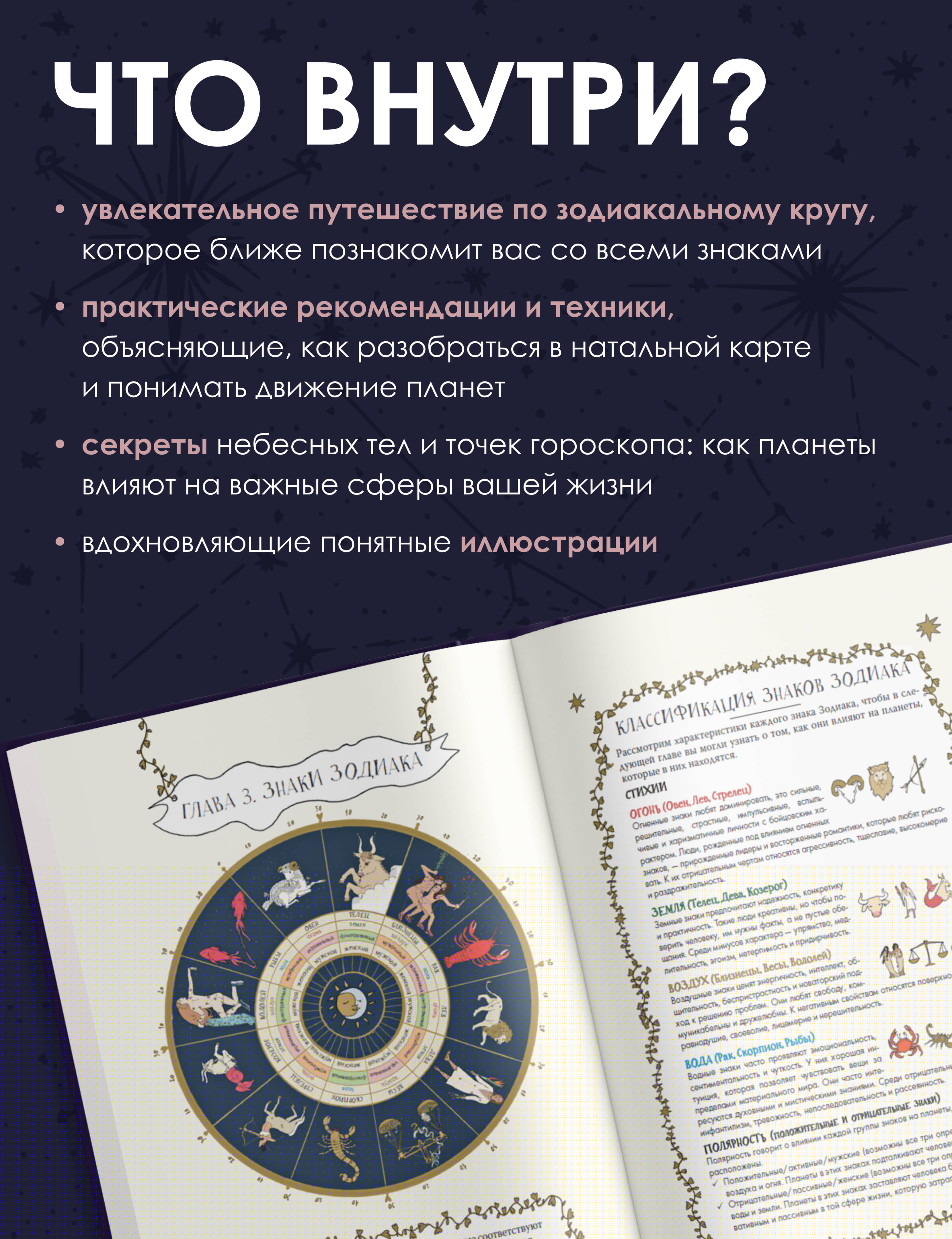 Эта яркая, великолепно иллюстрированная книга поможет вам погрузиться в мир астрологии, понять особенности каждого знака, их сильные и слабые стороны. Секреты небесных тел и точек гороскопа расскажут, как планеты и астрологические дома формируют вашу натальную карту и влияют на важные сферы жизни - от любви до карьеры. Практические рекомендации и техники научат интерпретировать астрологические карты, а вдохновляющие иллюстрации и мифы оживят сложные концепции и сделают их доступными даже для начинающих.| Издательство | Издательство "АСТ" |