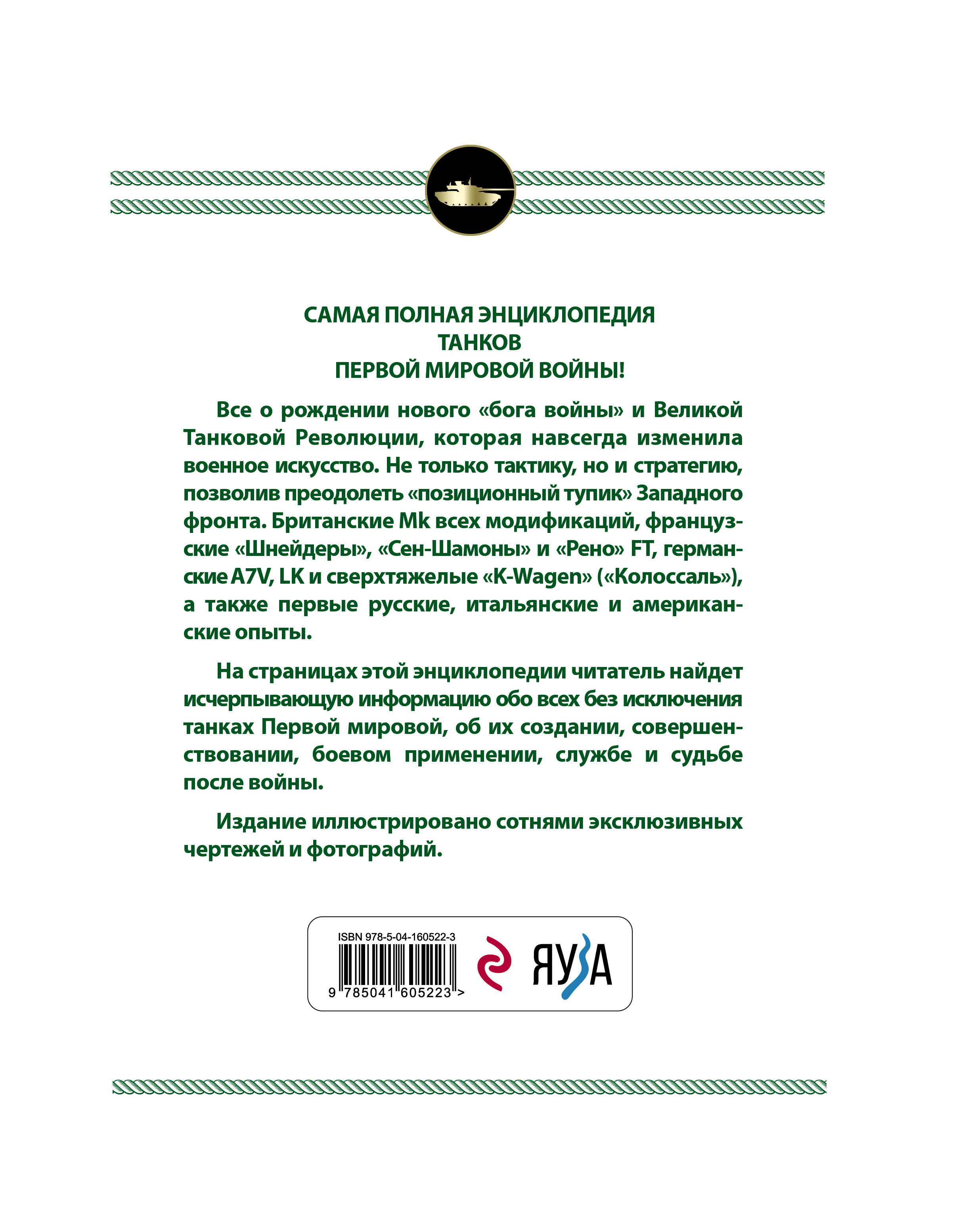 САМАЯ ПОЛНАЯ ЭНЦИКЛОПЕДИЯ ТАНКОВ ПЕРВОЙ МИРОВОЙ ВОЙНЫ! Всё о рождении нового «бога войны» и Великой Танковой Революции, которая навсегда изменила военное искусство. Не только тактику, но и стратегию, позволив преодолеть «позиционный тупик» Западного фронта. Британские Mk всех модификаций, французские «Шнейдеры», «Сен-Шамоны» и «Рено» FT, германские A7V, LK и сверхтяжёлые «K-Wagen» («Колоссаль»), а также первые русские, итальянские и американские опыты. На страницах этой энциклопедии читатель найдет исчерпывающую информацию обо всех без исключения танках Первой мировой, об их создании, совершенствовании, боевом применении, службе и судьбе после войны. Издание иллюстрировано сотнями эксклюзивных чертежей и фотографий.| Издательство | ООО "Издательство "Эксмо" |