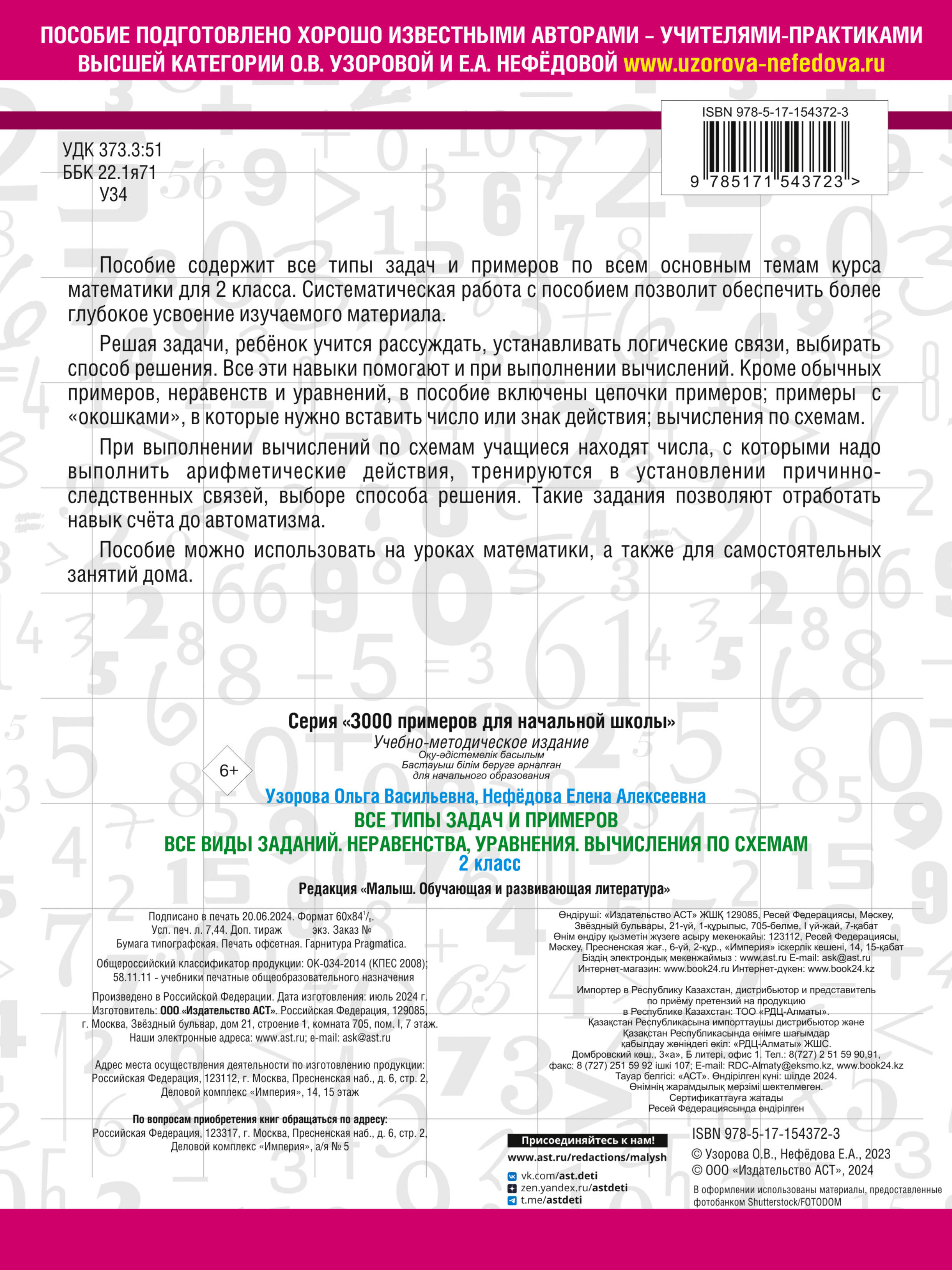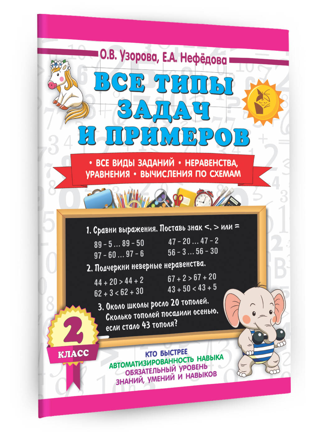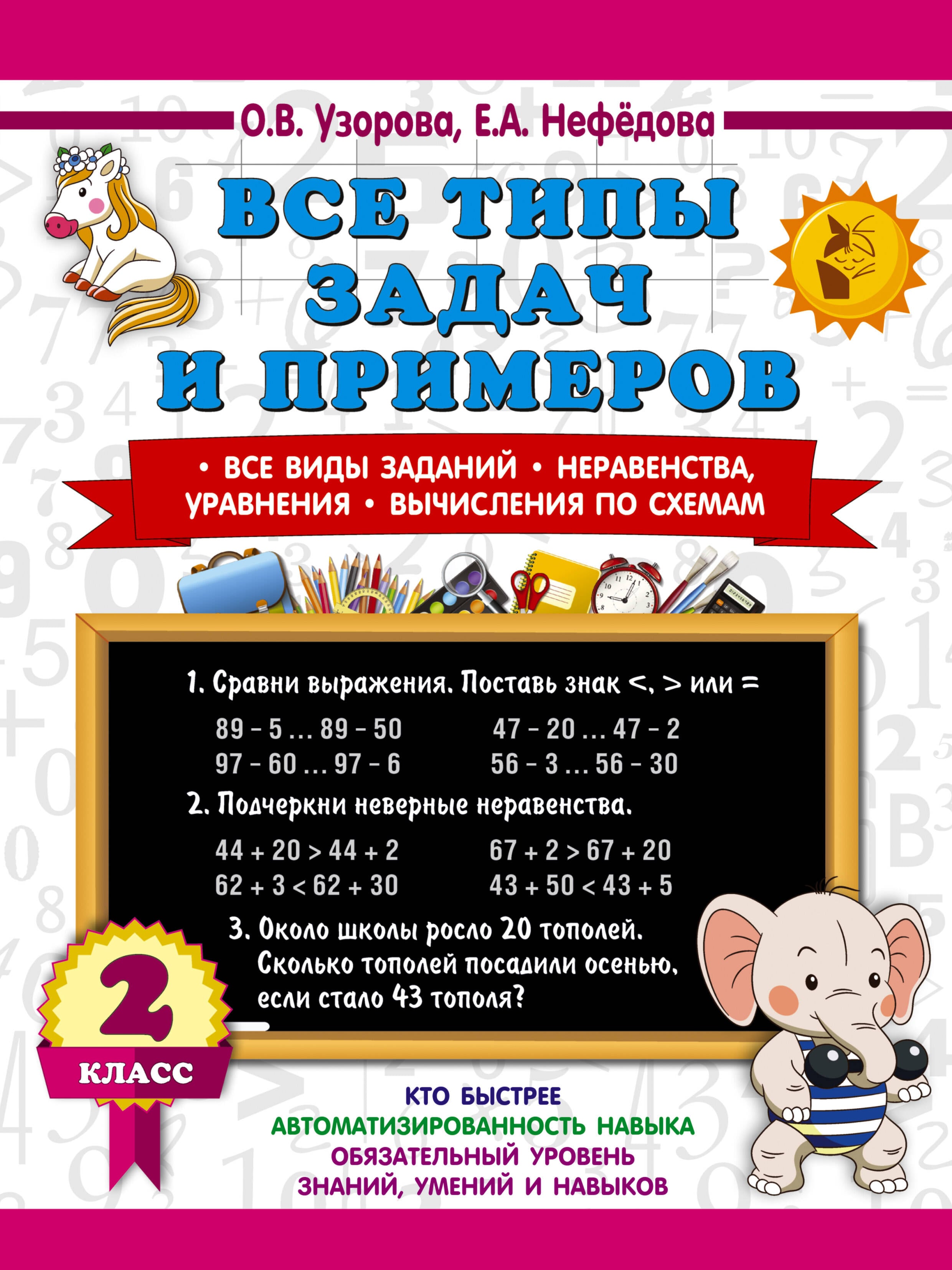 В одной книге собраны все типы задач и примеров, неравенства и уравнения, цепочки примеров; примеры с «окошками», в которые нужно вставить число или знак действия; вычисления по схемам по всем темам математики для 2 класса. Выполняя задания пособия, ребенок научится решать задачи без ошибок и отработает навык счёта до автоматизма. О. В. Узорова и Е.А Нефёдова - известные педагоги-практики, авторы самых издаваемых учебников и учебных пособий в России. Основанные на авторской методике, доказавшей свою эффективность миллионными тиражами, эти пособия помогут родителям подготовить ребенка к школе, а ученикам - легко и эффективно освоить программу начальной школы.