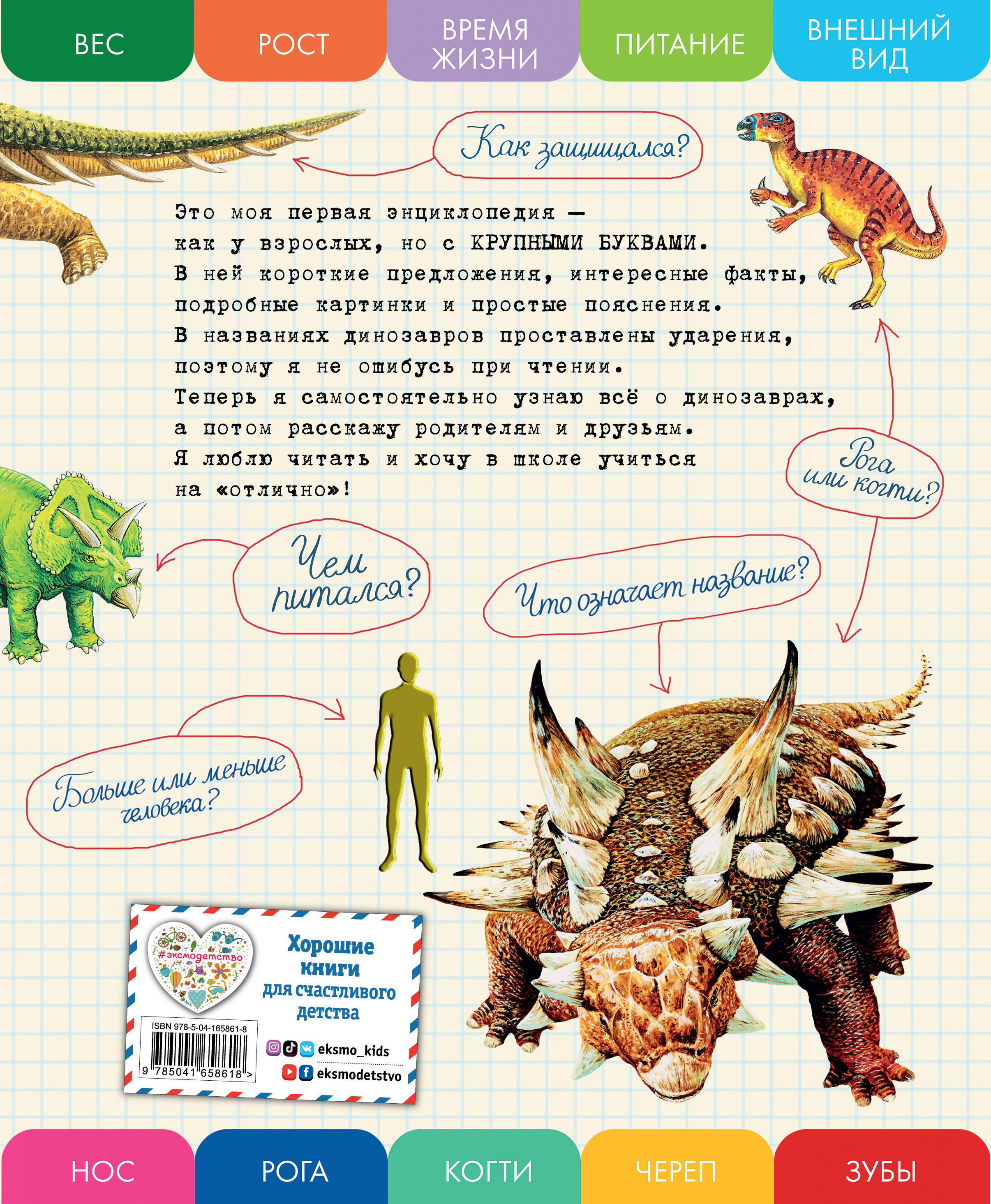 Теперь и у маленьких читателей есть своя собственная энциклопедия, как у взрослых: все только самое интересное - С КРУПНЫМИ БУКВАМИ. - На каждой странице - один динозавр. - Большая картинка с поясняющими короткими подписями. - Общий текст о динозавре. - Таблица с интересными фактами и наглядными сравнительными размерами динозавра и человека. В этой энциклопедии собрано 118 растительноядных динозавра.| Издательство | Эксмо |