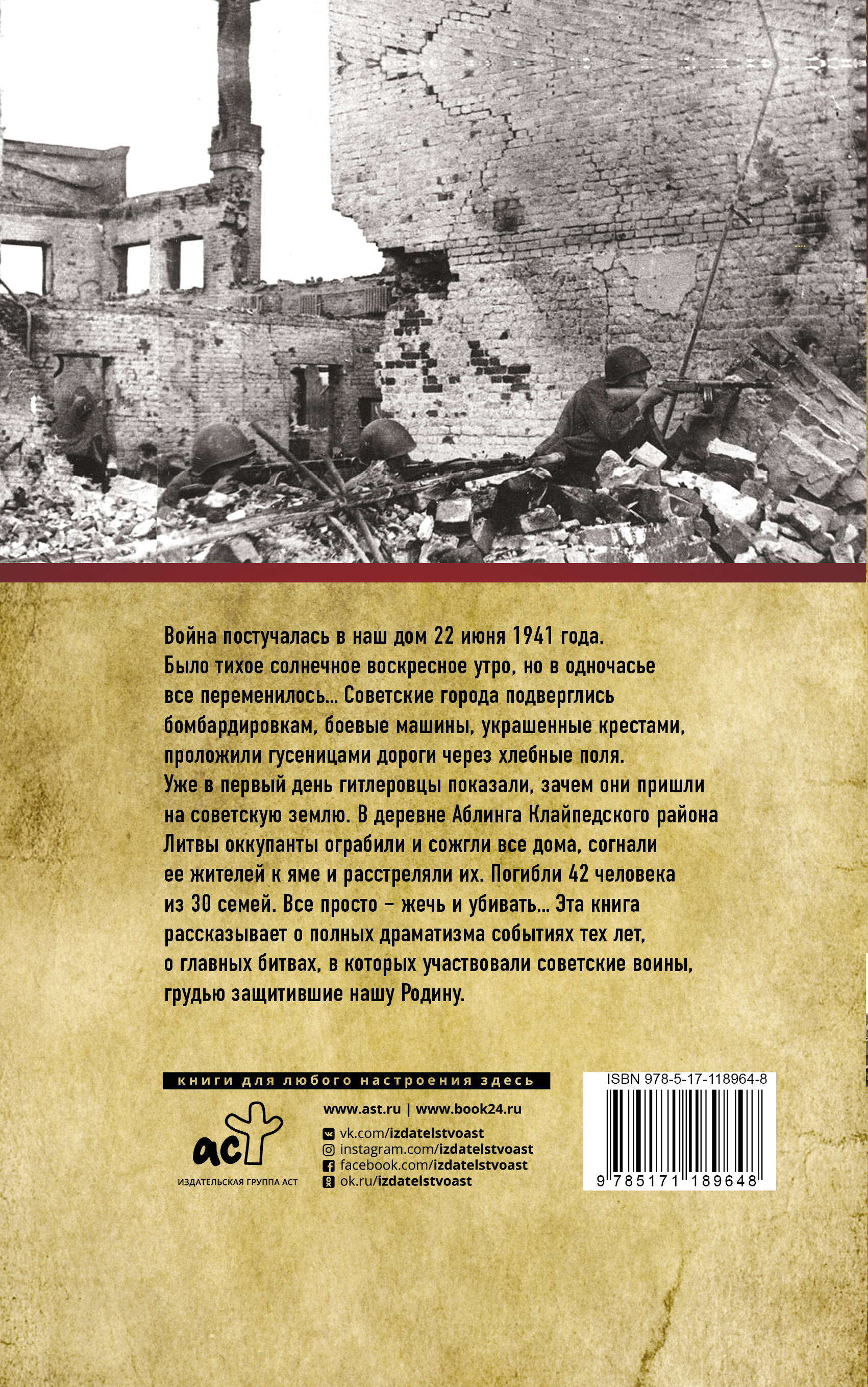 Война постучалась в наш дом 22 июня 1941 года. Было тихое солнечное воскресное утро, но в одночасье все переменилось… Советские города подверглись бомбардировкам, боевые машины, украшенные крестами, проложили гусеницами дороги через хлебные поля. Уже в первый день гитлеровцы показали, зачем они пришли на советскую землю. В деревне Аблинга Клайпедского района Литвы оккупанты ограбили и сожгли все дома, согнали ее жителей к яме и расстреляли их. Погибли 42 человека из 30 семей. Все просто - жечь и убивать… Эта книга рассказывает о полных драматизма событиях тех лет, о главных битвах, в которых участвовали советские воины, грудью защитившие нашу Родину.| Издательство | Издательство "АСТ" |