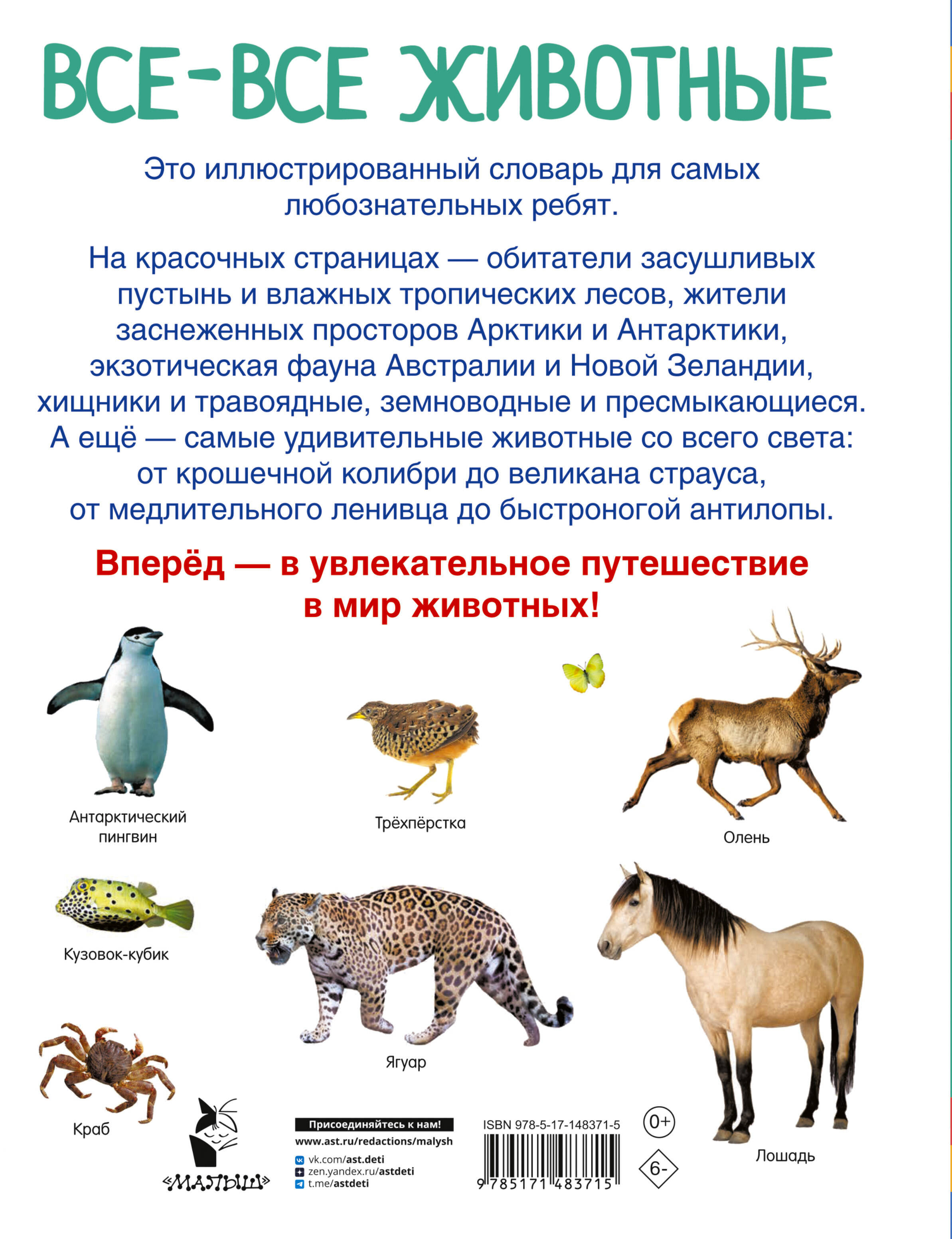 «Все-все животные» - это красочно иллюстрированный словарь для детей. На его страницах малышей ждёт встреча с животными со всего света: обитателями тропиков, океанов и рек, представителями фауны тайги и тундры, существами ползающими, прыгающими, плавающими и летающими. Книга поможет ребёнку сделать первые шаги в изучении фауны нашей планеты, узнать названия животных, расширить кругозор.| Издательство | Издательство "АСТ" |