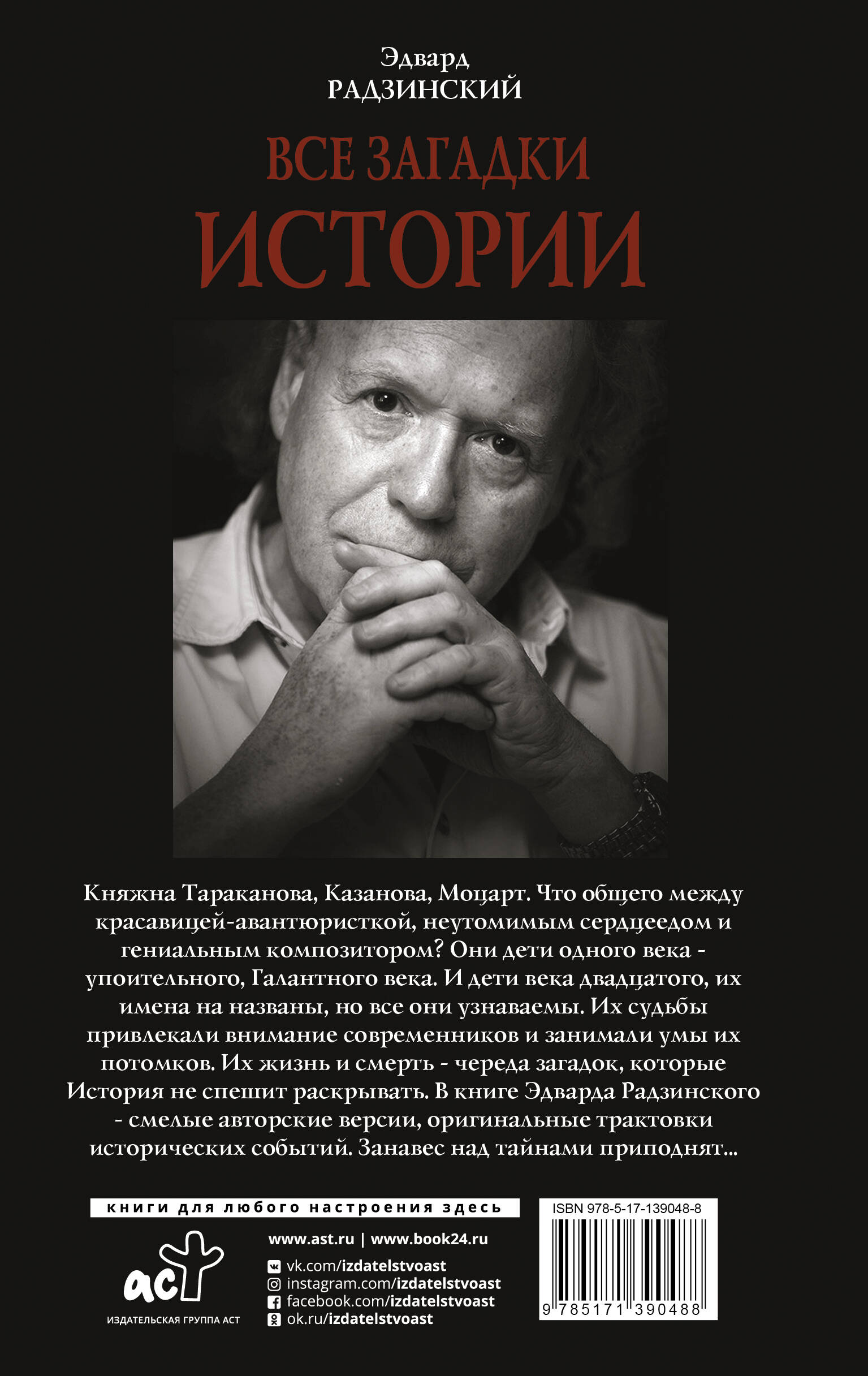 Княжна Тараканова, Казанова, Моцарт. Что общего между красавицей-авантюристкой, неутомимым сердцеедом и гениальным композитором? Они дети одного века - упоительного, Галантного века. И дети века двадцатого, их имена на названы, но все они узнаваемы. Их судьбы привлекали внимание современников и занимали умы их потомков. Их жизнь и смерть - череда загадок, которые История не спешит раскрывать. В книге Эдварда Радзинского - смелые авторские версии, оригинальные трактовки исторических событий. Занавес над тайнами приподнят...| Издательство | Издательство "АСТ" |