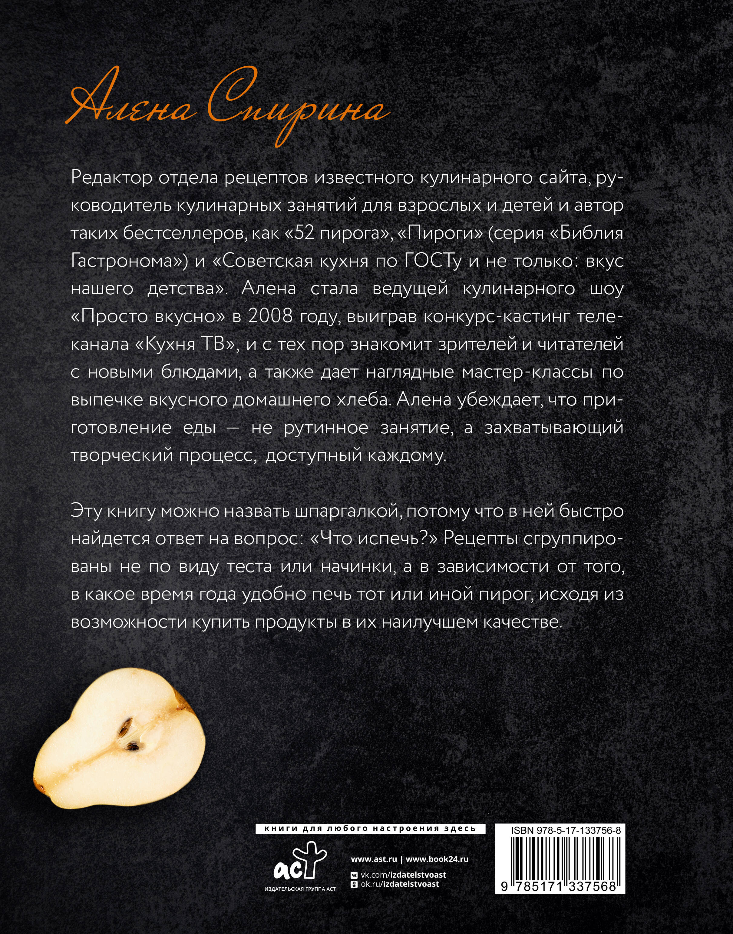 Алена Спирина - редактор отдела рецептов известного кулинарного сайта, руководитель кулинарных занятий для взрослых и детей и автор таких бестселлеров, как: "52 пирога", "Пироги" (серия "Книги Гастронома") и "Советская кухня по ГОСТу и не только: вкус нашего детства". Алена стала ведущей кулинарного шоу "Просто вкусно" в 2008 году, выиграв конкурс-кастинг телеканала "Кухня ТВ", и с тех пор знакомит зрителей и читателей с новыми блюдами, а также дает наглядные мастер-классы по выпечке вкусного домашнего хлеба. Алена убеждает, что приготовление еды - не рутинное занятие, а захватывающий творческий процесс, доступный каждому. Эту книгу можно назвать шпаргалкой, потому что в ней можно быстро найти ответ на вопрос: "Что испечь?". Рецепты сгруппированы не по виду теста или начинки, а в зависимости от того, в какое время года удобно печь тот или иной пирог, исходя из возможности купить продукты в их наилучшем качестве. Книга "Всегда пирог: пошаговые рецепты самых вкусных пирогов" для тех, кто давно мечтает научиться печь пироги, чтобы баловать семью вкусной и безопасной выпечкой; для тех, кто хочет освоить новые рецепты не только пирогов, ведь любая начинка - это еда.| Издательство | ИЗДАТЕЛЬСТВО "АСТ" |
