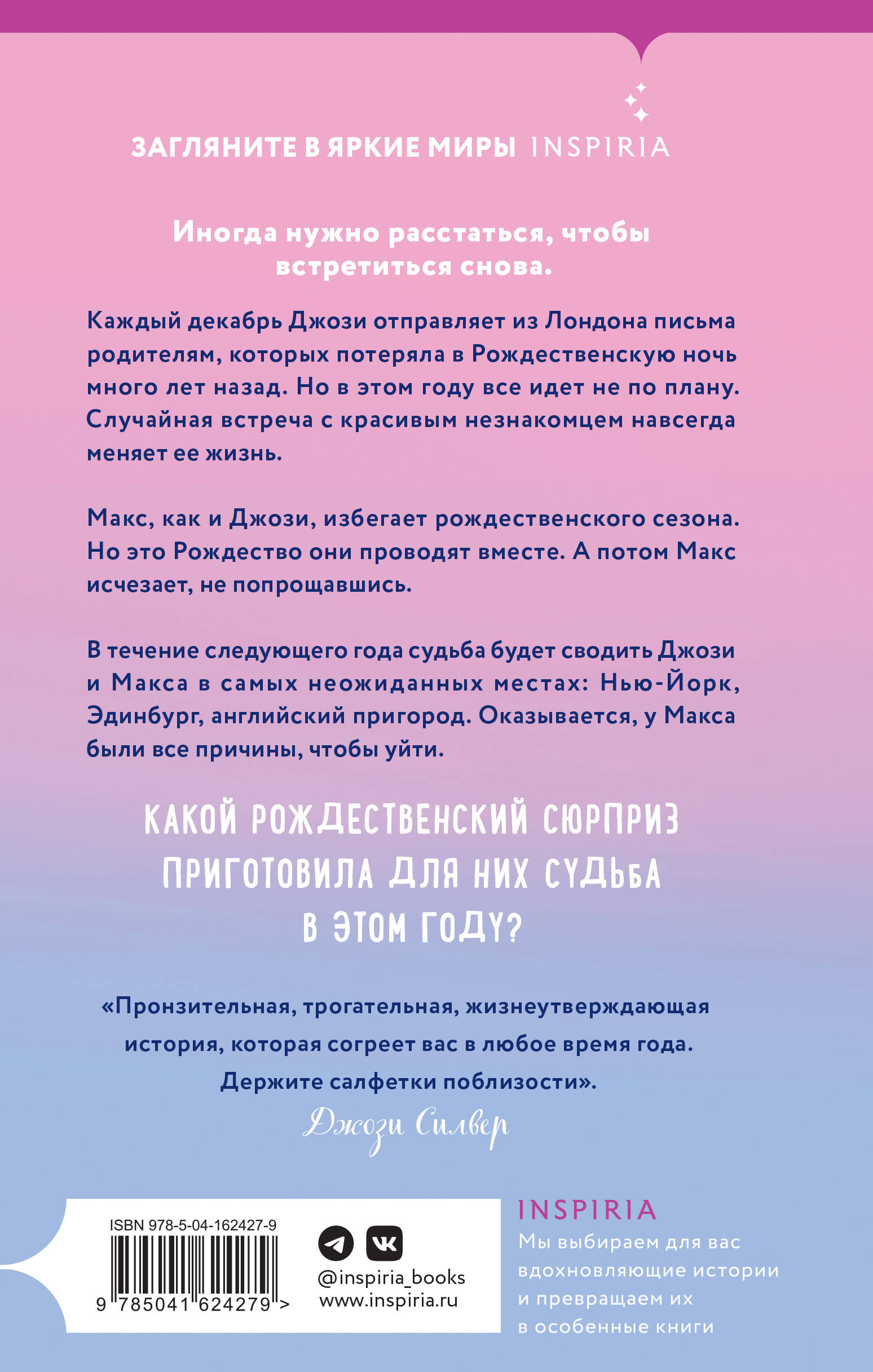 Все началось с письма. Все закончилось историей любви. Эта книга - тот самый фильм, который мы пересматриваем каждый год, чтобы вновь поверить в чудо. Каждый декабрь Джози отправляет из Лондона письма родителям, которых потеряла в рождественскую ночь много лет назад. Но в этом году все идет не по плану. Случайная встреча с красивым незнакомцем навсегда меняет ее жизнь. Макс, как и Джози, избегает рождественского сезона. Но это Рождество они проводят вместе. А потом Макс исчезает, не попрощавшись. В течение следующего года судьба будет сводить Джози и Макса в самых неожиданных местах: Нью-Йорк, Эдинбург, английский пригород. Оказывается, у Макса были все причины, чтобы уйти. Какой рождественский сюрприз приготовила для них судьба в этом году? «Пронзительная, трогательная, жизнеутверждающая история, которая cогреет вас в любое время года. Держите салфетки поблизости». - Джози Силвер| Издательство | ООО "Издательство "Эксмо" |