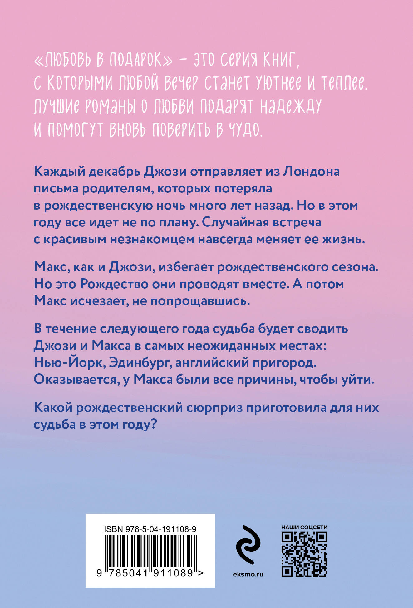 ЛЮБОВЬ В ПОДАРОК - это серия книг, с которыми любой вечер станет уютнее и теплее. Лучшие романы о любви, которые подарят надежду и заставят вновь поверить в чудо. Все началось с письма. Все закончилось историей любви. Эта книга - тот самый фильм, который мы пересматриваем каждый год, чтобы вновь поверить в чудо. Каждый декабрь Джози отправляет из Лондона письма родителям, которых потеряла в рождественскую ночь много лет назад. Но в этом году все идет не по плану. Случайная встреча с красивым незнакомцем навсегда меняет ее жизнь. Макс, как и Джози, избегает рождественского сезона. Но это Рождество они проводят вместе. А потом Макс исчезает, не попрощавшись. В течение следующего года судьба будет сводить Джози и Макса в самых неожиданных местах: Нью-Йорк, Эдинбург, английский пригород. Оказывается, у Макса были все причины, чтобы уйти. Какой рождественский сюрприз приготовила для них судьба в этом году?| Издательство | ООО "Издательство "Эксмо" |