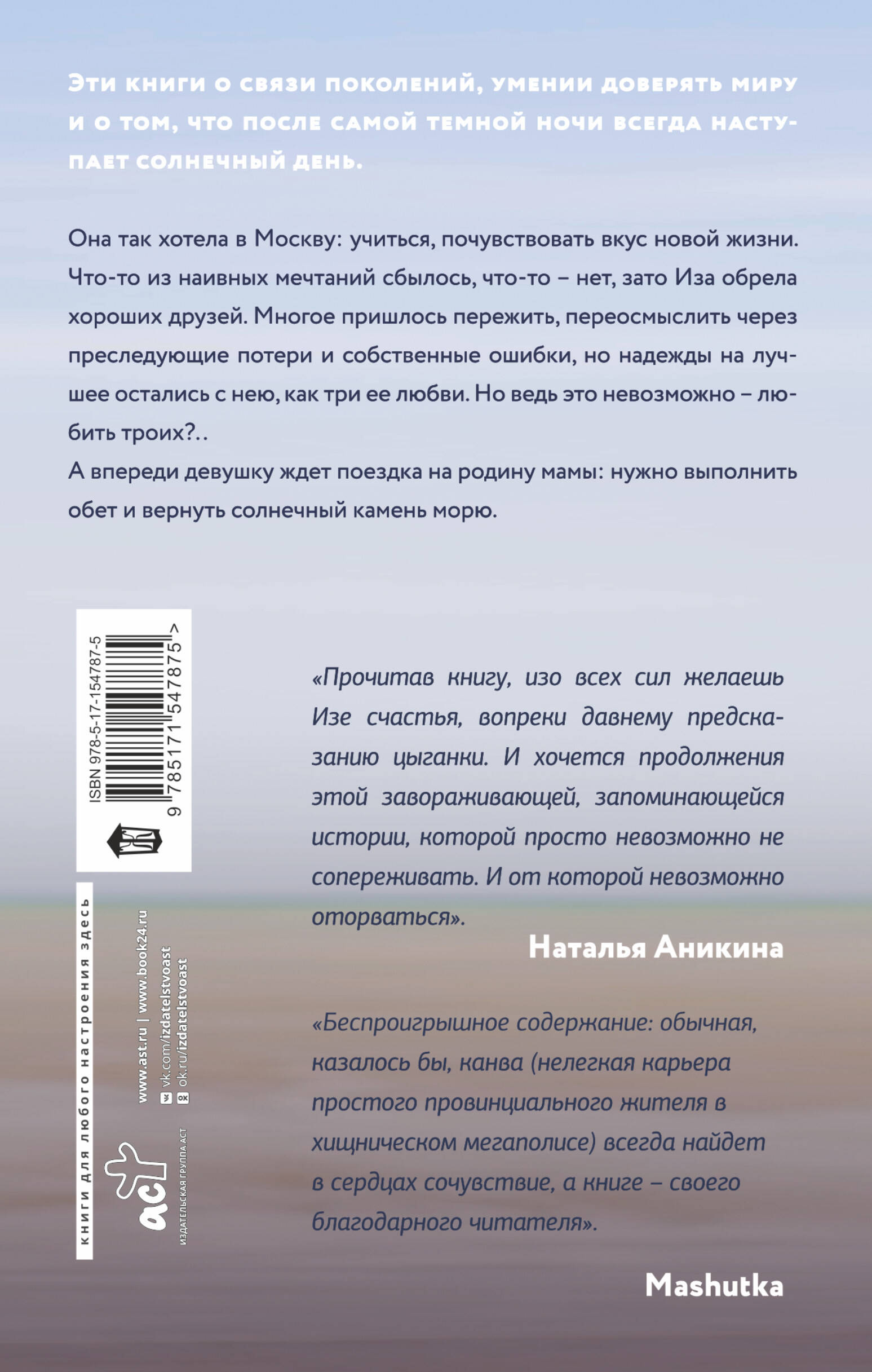 Она так хотела в Москву: учиться, почувствовать вкус новой жизни. Что-то из наивных мечтаний сбылось, что-то - нет, зато Иза обрела хороших друзей. Многое пришлось пережить, переосмыслить через преследующие потери и собственные ошибки, но надежды на лучшее остались с нею, как три ее любви. Но ведь это невозможно - любить троих?.. А впереди девушку ждет поездка на родину мамы: нужно выполнить обет и вернуть солнечный камень морю.| Издательство | ИЗДАТЕЛЬСТВО "АСТ" |