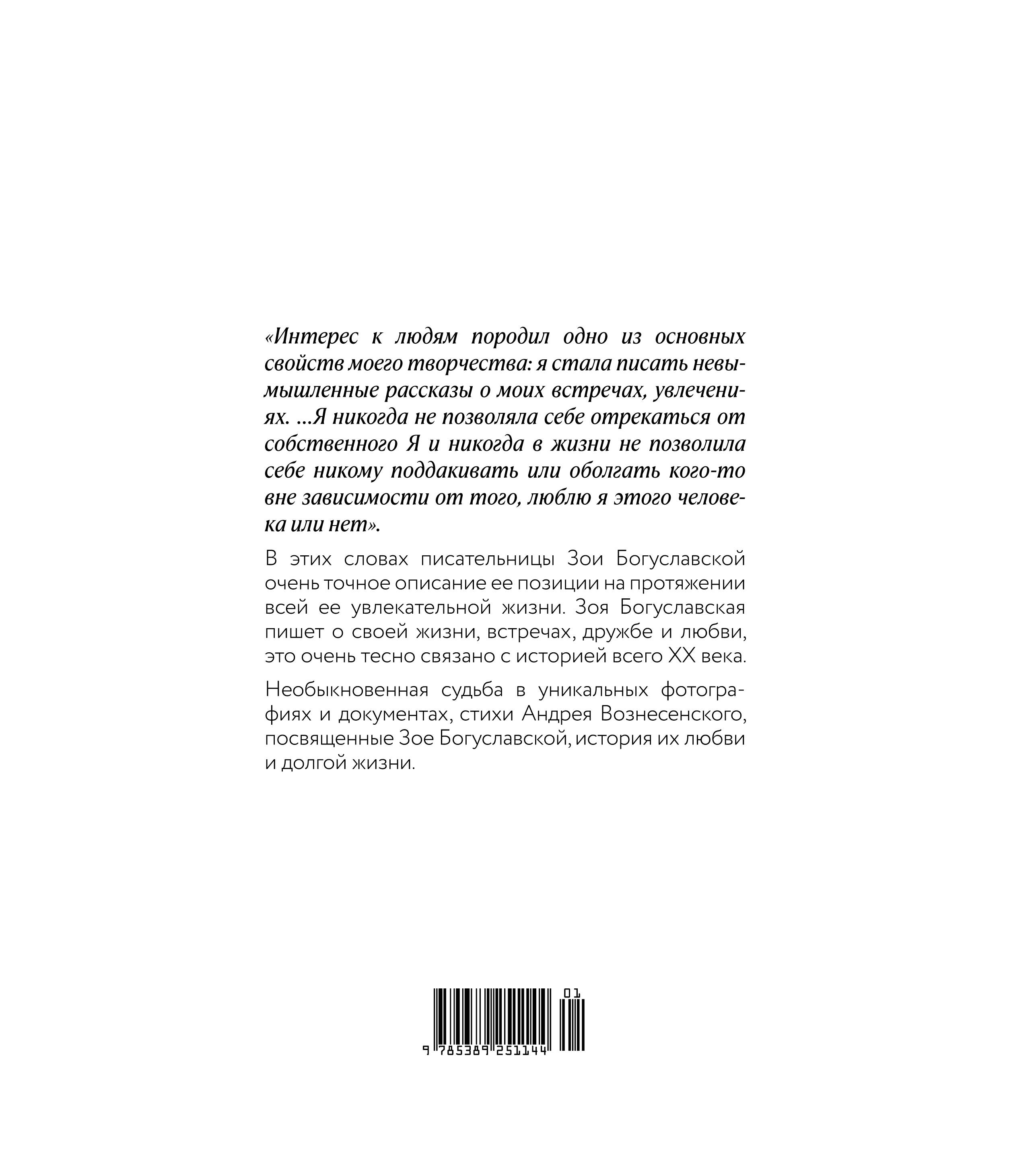 Необыкновенная судьба, невероятные встречи - Зоя Богуславская была музой Андрея Вознесенского,встречалась с Марком Шагалом, дружила с Владимиром Высоцким, Майей Плисецкой, Лилей Брик, Василием Аксеновым и многими-многими другими. Она ничего не боялась и никогда не отступала - Зоя Богуславская писатель и общественный деятель, организатор фондов, независимых премий и ассоциаций, поддерживающих деятелей культуры. Зое Богуславской исполнилось сто лет. Возраст немалый - целый век, несколько эпох за спиной, и каждый период своей жизни, каждый день она использовала, чтобы что-то создавать и кому-то помогать. Книга объединяет фотографии, документы, воспоминания Зои Богуславской, написанные ей и пятьдесят лет назад, и сегодня.| Издательство | Азбука-Аттикус Издат.группа ООО |