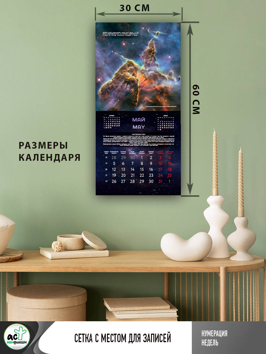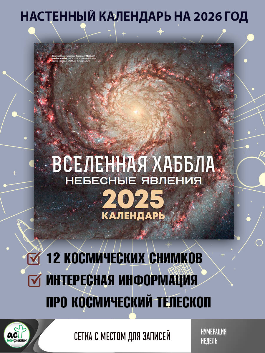 В этом календаре представлены подлинные фотографии космоса, сделанные легендарным космическим телескопом "Хаббл". Его открытия стали настоящим прорывом в астрономии - не только для ученых, но и для широкой публики. В отличие от своих предшественников, "Хаббл" сделал космос ближе, понятнее и увлекательнее для людей всех возрастов. Его яркие и детализированные снимки стали основой для важнейших научных открытий, касающихся структуры и развития Вселенной, агалктик, туманностей, звезд, экзопланет и ближайших объектов в нашей Солничной системе. Благодаря наблюдениям "Хаббла" мы по-новому взглянули на бескрайний космос и на собственное место в нем.| Издательство | Издательство "АСТ" |