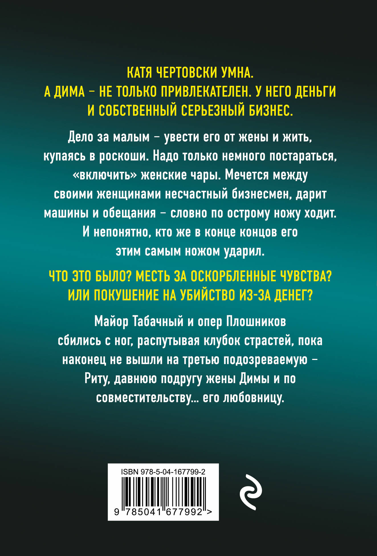 Катя чертовски умна. А Дима - не только привлекателен. У него деньги и собственный серьезный бизнес. Дело за малым - увести его от жены и жить, купаясь в роскоши. Надо только немного постараться, «включить» женские чары. Мечется между своими женщинами несчастный бизнесмен, дарит машины и обещания - словно по острому ножу ходит. И непонятно, кто же, в конце концов, его этим самым ножом ударил. Что это было? Месть за оскорбленные чувства? Или покушение на убийство из-за денег? Майор Табачный и опер Плошников сбились с ног, распутывая клубок страстей, пока, наконец, не вышли на третью подозреваемую - Риту, давнюю подругу жены Димы и по совместительству… его любовницу.