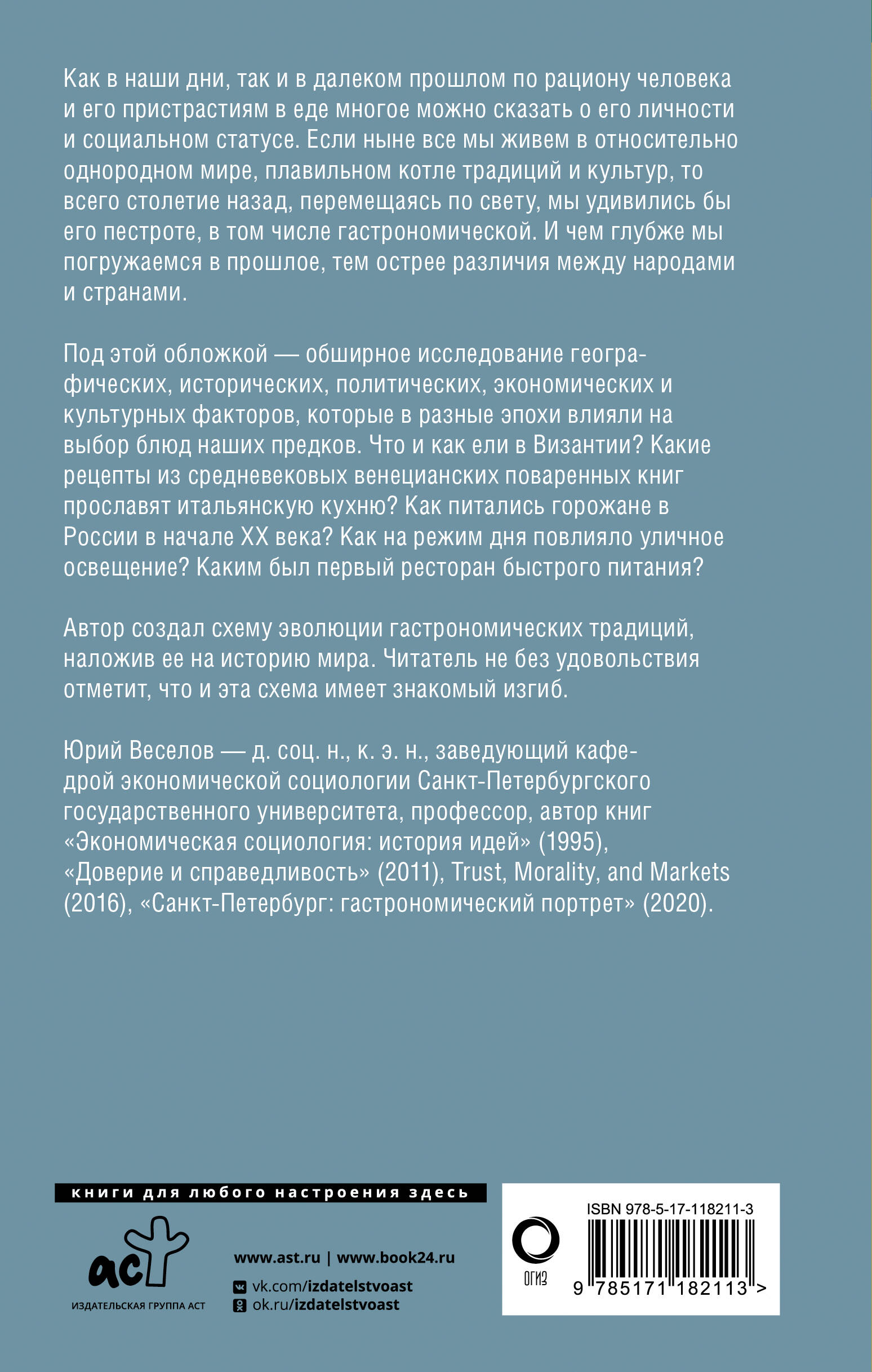 Это обширное исследование географических, исторических, политических, экономических и культурных факторов, которые в разные эпохи влияли на выбор блюд наших предков. Что и как ели в Византии? Какие рецепты из средневековых венецианских поваренных книг прославят итальянскую кухню? Как питались горожане в России в начале XX века? Как на режим дня повлияло уличное освещение? Каким был первый ресторан быстрого питания? Автор создал схему эволюции гастрономических традиций, наложив ее на историю мира, экономику и социологию.| Издательство | ИЗДАТЕЛЬСТВО "АСТ" |