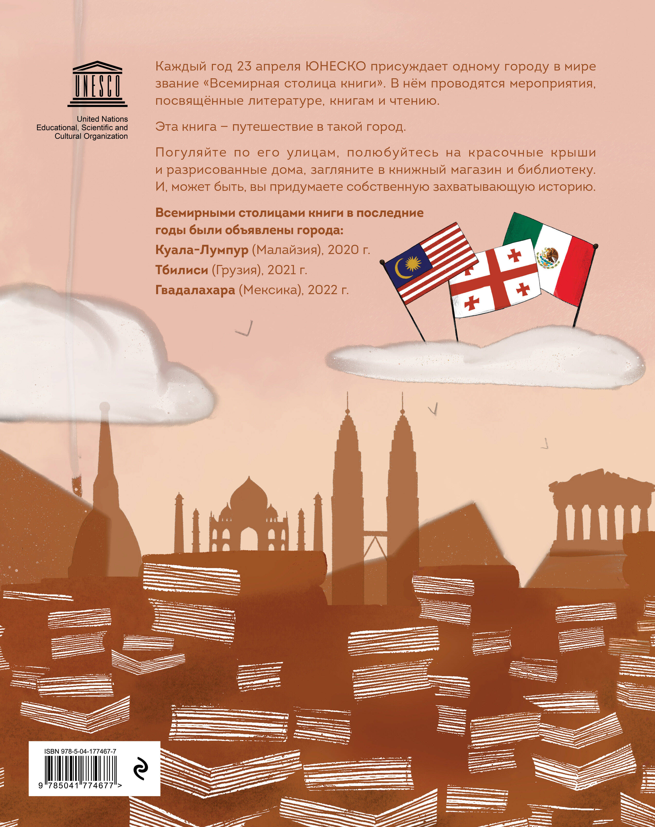 Эта книга - путешествие в удивительный волшебный город. В нём повсюду книги и знания. Люди рассказывают друг другу интересные истории в парках, на детских площадках, в музеях и торговых центрах. На каждом шагу там библиотеки и книжные магазины. Улицы украшены захватывающими сюжетами и красочными страницами. Погуляйте по этому городу и вдохновитесь его атмосферой. Может быть, вы придумаете свой захватывающий сюжет! Каждый год 23 апреля ЮНЕСКО присуждает одному городу в мире звание «Всемирная столица книги». В нём проводятся мероприятия, посвящённые литературе, книгам и чтению. В последние годы такими городами были: - Куала-Лумпур, Малайзия (2020 г.); - Тбилиси, Грузия (2021 г.); - Гвадалахара, Мексика (2022 г.).| Издательство | ООО "Издательство "Эксмо" |