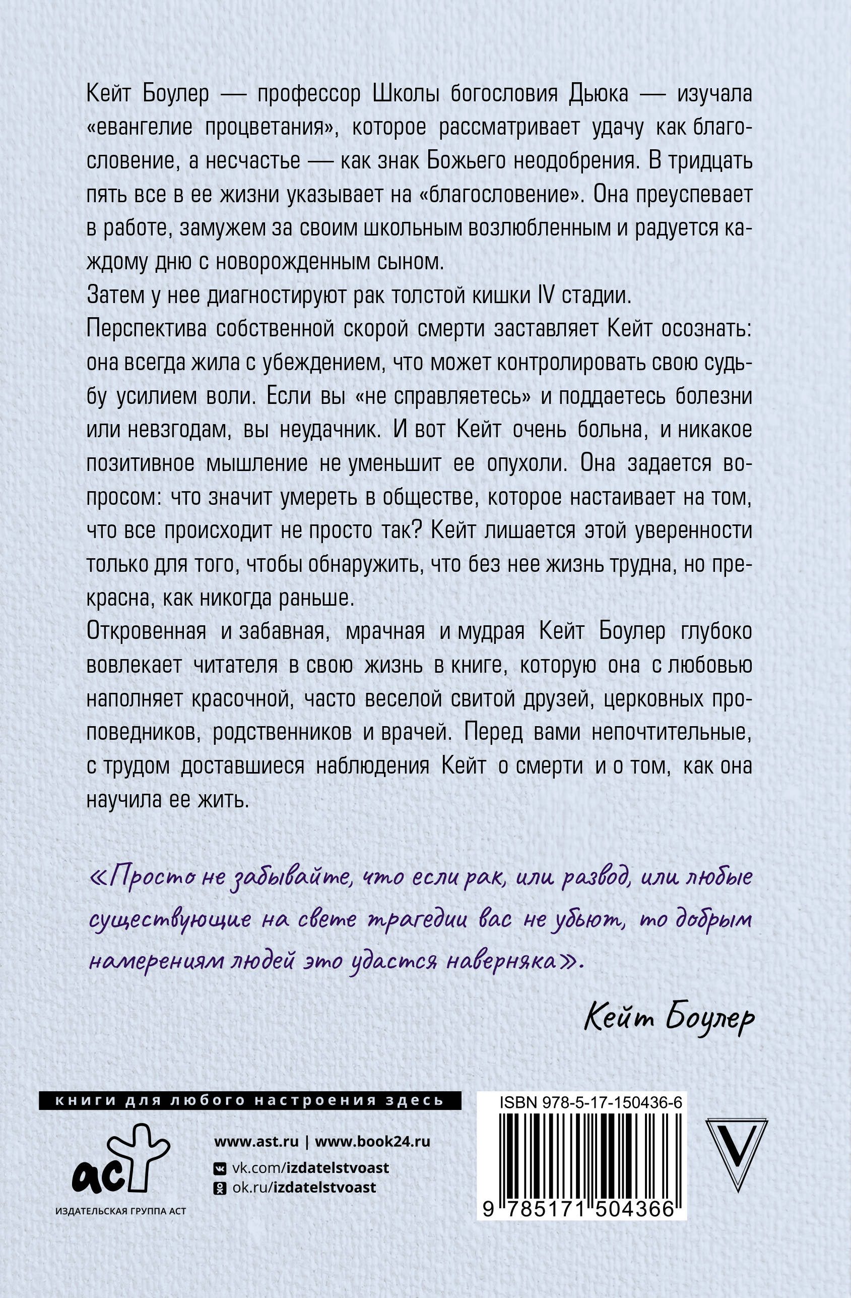 Чем вы утешаете себя в трудные моменты жизни? И как жить, если все источники утешения уже исчерпаны? Профессор богословия Кейт Боулер серьезно изучает этот вопрос с тех пор, как в возрасте 35 лет столкнулась со страшным диагнозом - раком четвертой стадии. Когда твоя жизнь вот-вот прервется, сохранять веру в высшую справедливость и благо трудно… В этот момент все инструменты позитивного мышления летят в мусорную корзину, а источники утешения, которые дарит нам религия, пересыхают. Автор задается вопросом: что значит умереть в обществе, которое настаивает на том, что все происходит не просто так? С этой книгой вы обретете опору в себе и найдете ответ там, где его вовсе не принято искать.| Издательство | ИЗДАТЕЛЬСТВО "АСТ" |