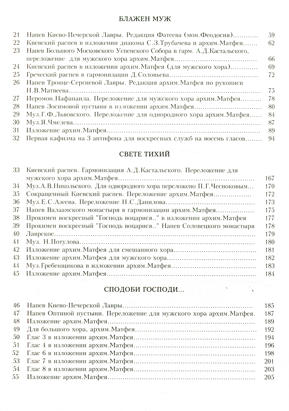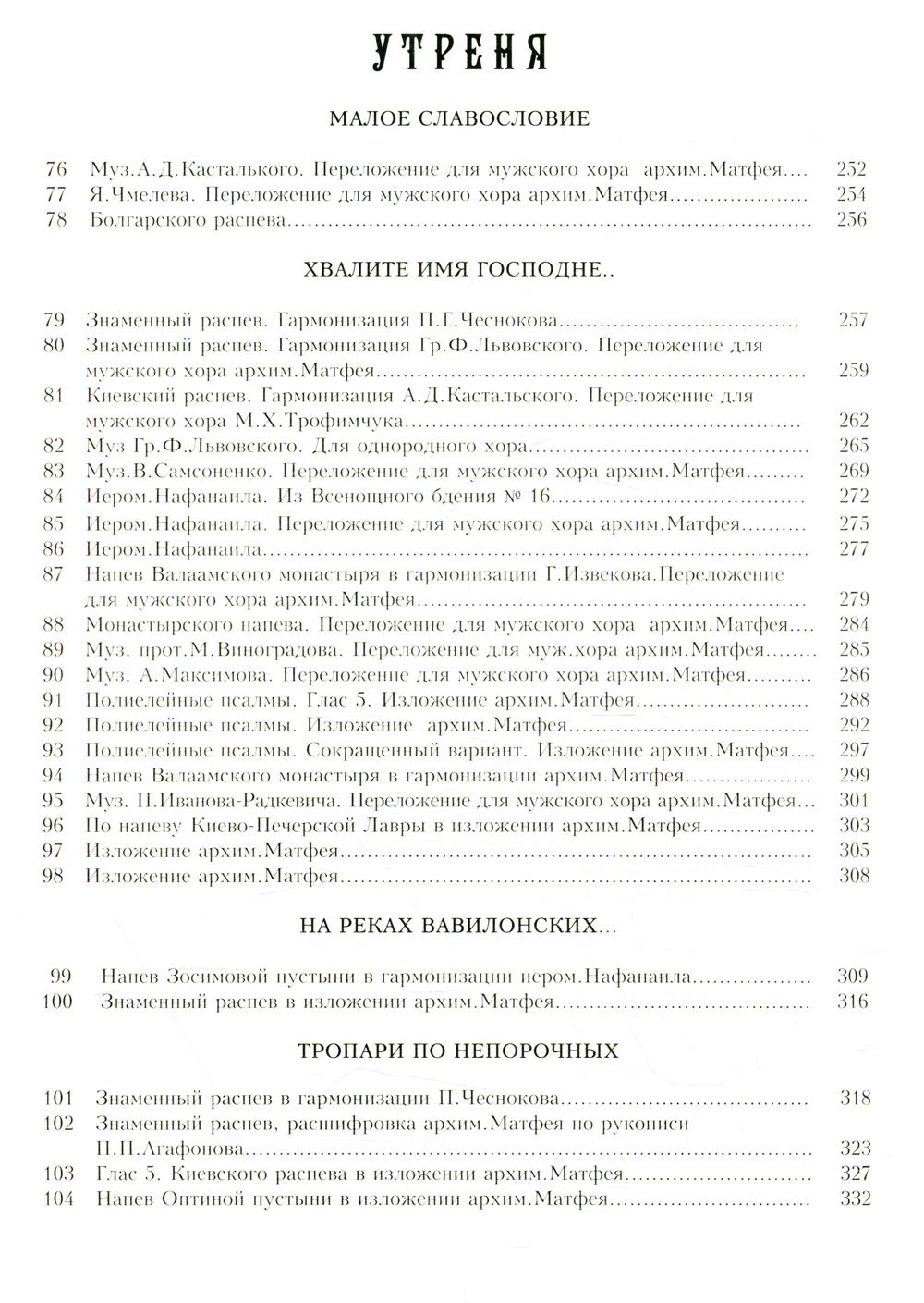 В издании собраны наиболее популярные распевы песнопений Всенощного бдения под редакцией архим. Матфея (Мормыля). Это своего рода обобщение того музыкального опыта, который коренится в древних монастырских напевах Троице-Сергиевой Лавры, а также «делании» связанных с нею композиторов. Издание послужит замечательным подарком для участника церковного хора, а благодаря качественному переплету ноты сохранятся в хорошем состоянии на долгие годы.| Издательство | Свято-Троицкий Ново-Голутвин монастырь |