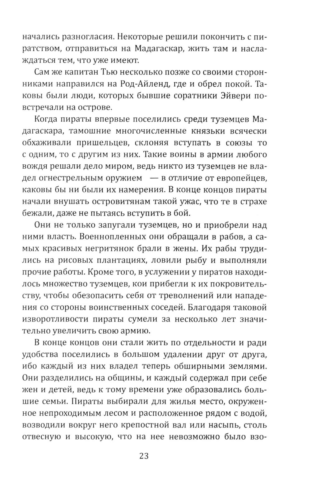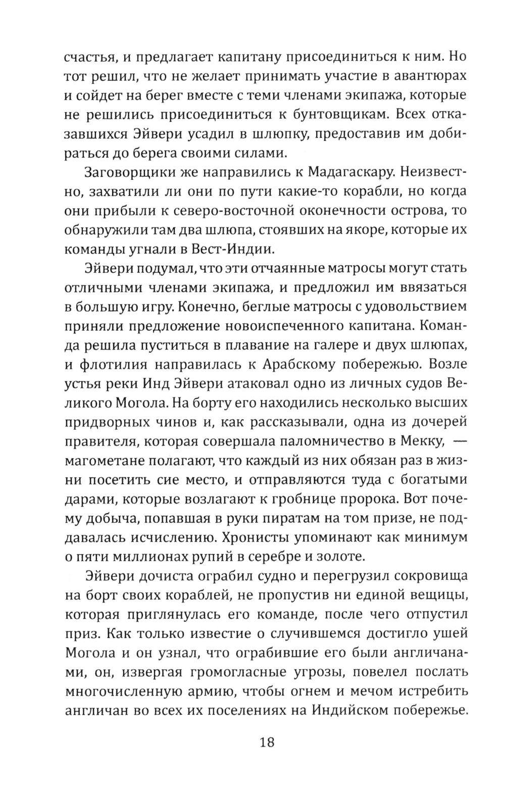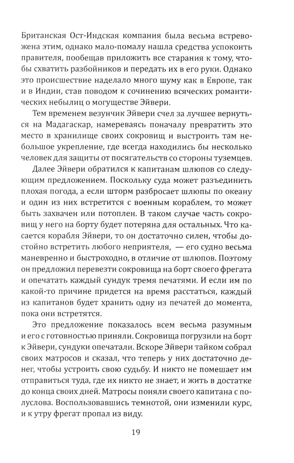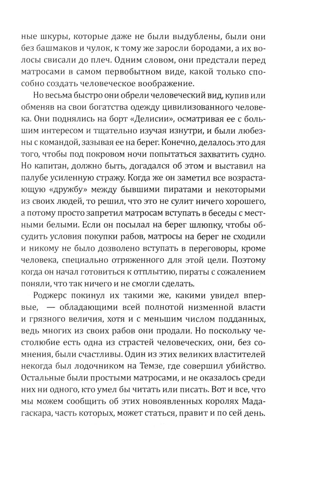 Сборник Даниэля Дефо (1660-1731) - классика мировой литературы, автора «Робинзона Крузо», открывает его классический труд об одной из самых захватывающих страниц мировой истории. Из него мир узнал о знаменитых морских разбойниках - Уильяме Кидде, Эвери, Тиче (он же Чёрная Борода); и пиратках - Мэри Рид и Энн Бонни. Об этих флибустьерах и корсарах мы читали в приключенческих романах, следили за перипетиями их судеб по любимым кинофильмам. А из этой книги мы узнаем о них всю правду! Долгое время ее авторство приписывалось «капитану Чарлзу Джонсону» (именно его имя фигурирует на титульной странице оригинала). Исследователи, однако, пришли к выводу, что «капитан Чарлз Джонсон» - один из многочисленных псевдонимов великого английского писателя Даниеля Дефо. В сборник включен также захватывающий авантюрный роман «Жизнь и пиратские приключения славного капитана Синглтона», основанный на биографии пирата XVII века Генри Эвери.| Издательство | Родина |