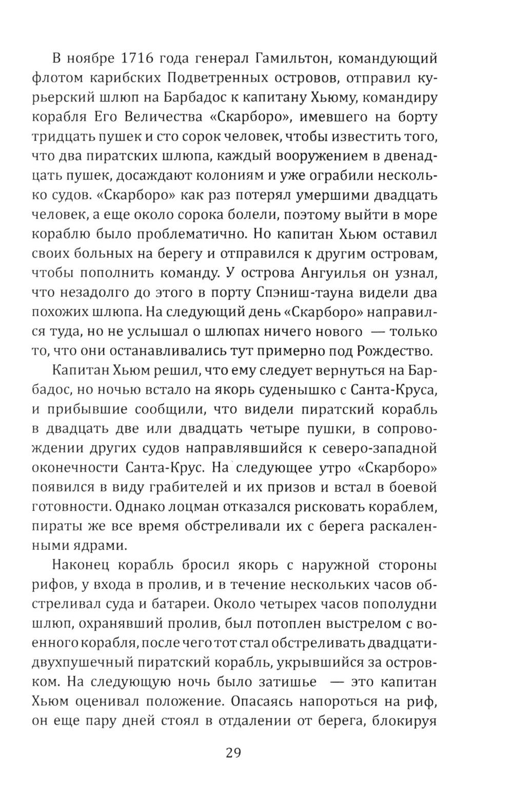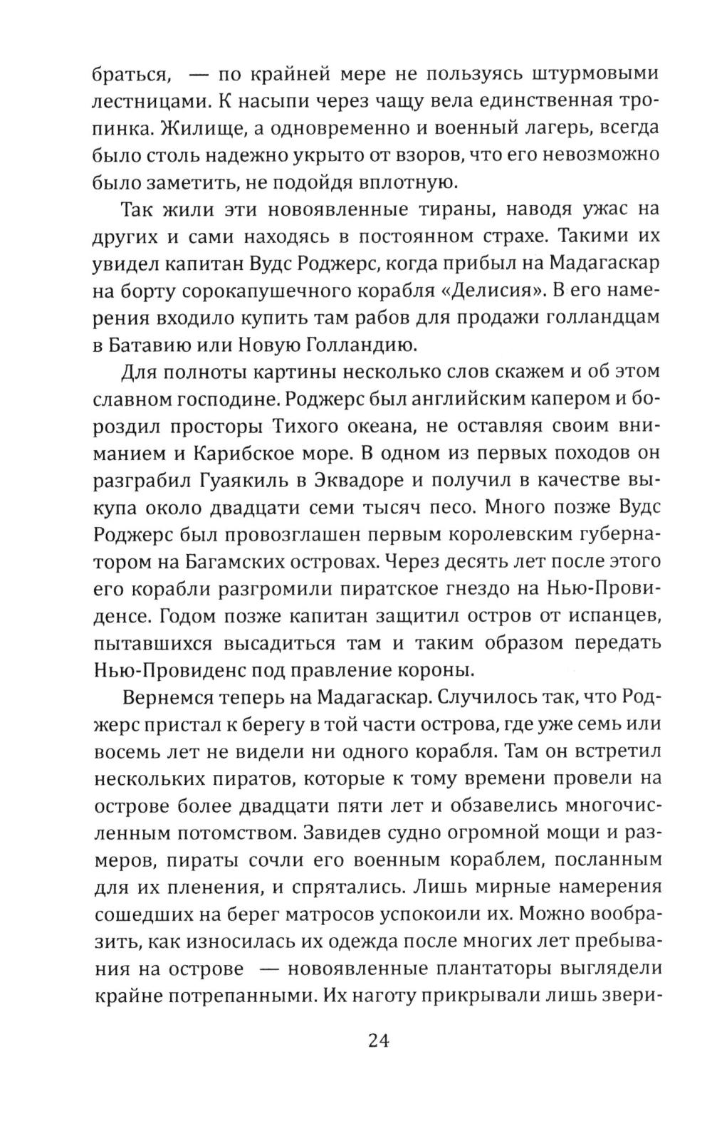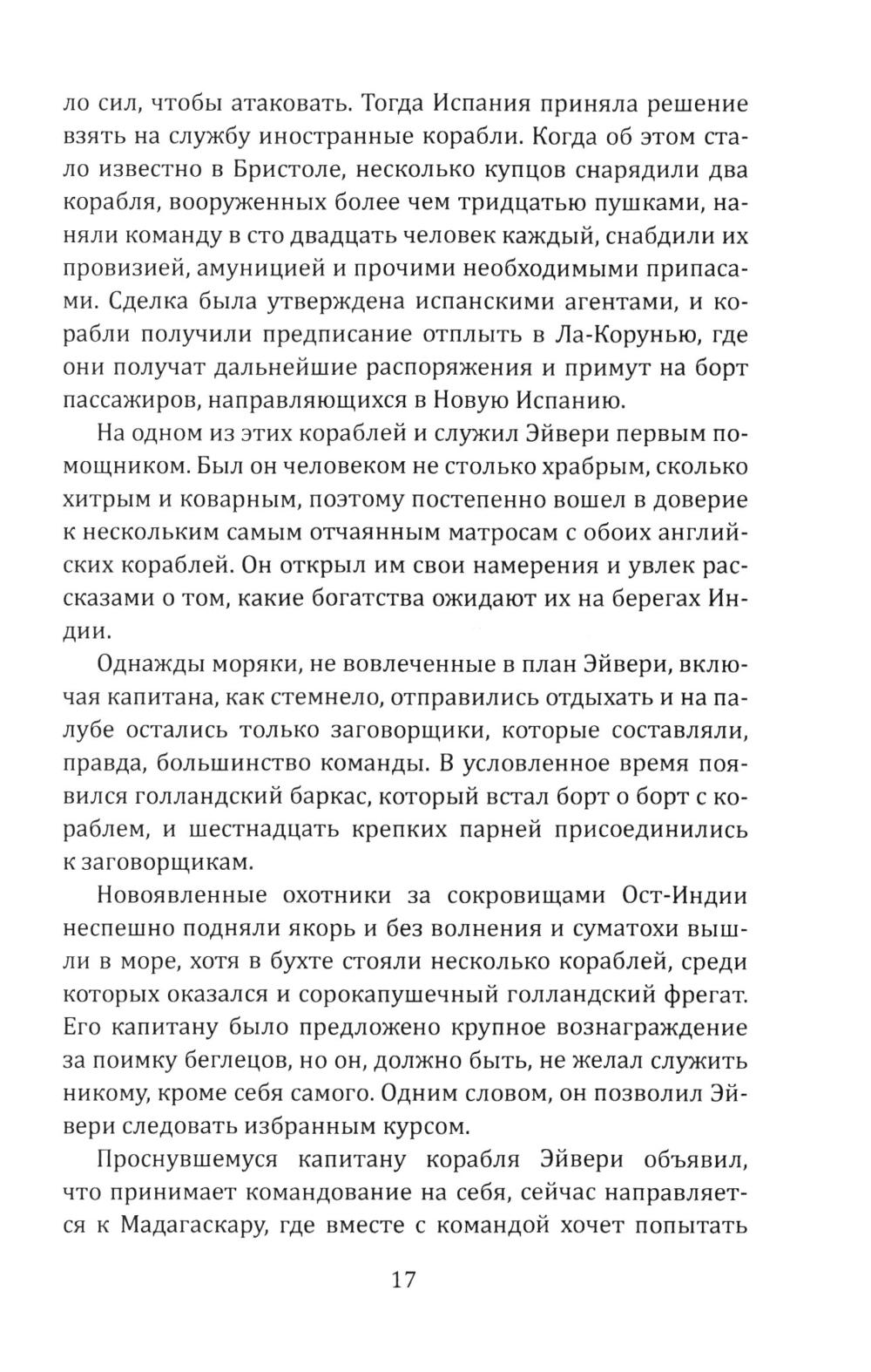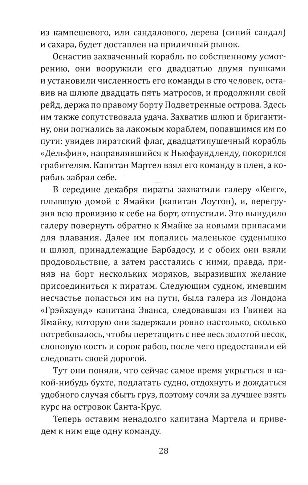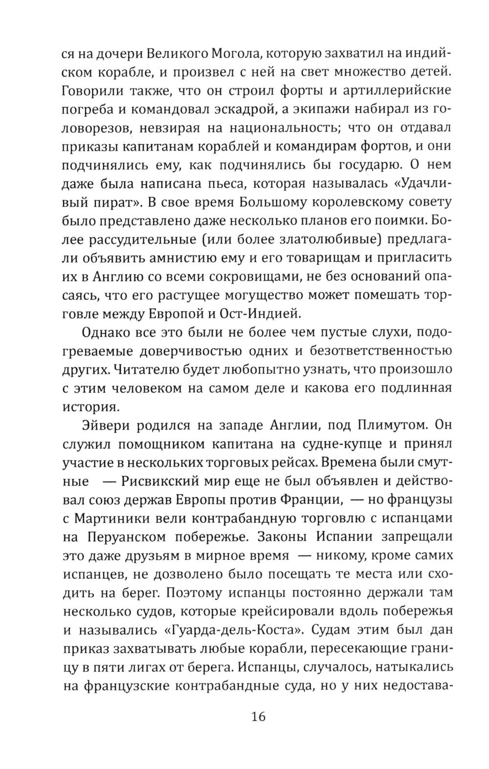 Сборник Даниэля Дефо (1660-1731) - классика мировой литературы, автора «Робинзона Крузо», открывает его классический труд об одной из самых захватывающих страниц мировой истории. Из него мир узнал о знаменитых морских разбойниках - Уильяме Кидде, Эвери, Тиче (он же Чёрная Борода); и пиратках - Мэри Рид и Энн Бонни. Об этих флибустьерах и корсарах мы читали в приключенческих романах, следили за перипетиями их судеб по любимым кинофильмам. А из этой книги мы узнаем о них всю правду! Долгое время ее авторство приписывалось «капитану Чарлзу Джонсону» (именно его имя фигурирует на титульной странице оригинала). Исследователи, однако, пришли к выводу, что «капитан Чарлз Джонсон» - один из многочисленных псевдонимов великого английского писателя Даниеля Дефо. В сборник включен также захватывающий авантюрный роман «Жизнь и пиратские приключения славного капитана Синглтона», основанный на биографии пирата XVII века Генри Эвери.| Издательство | Родина |
