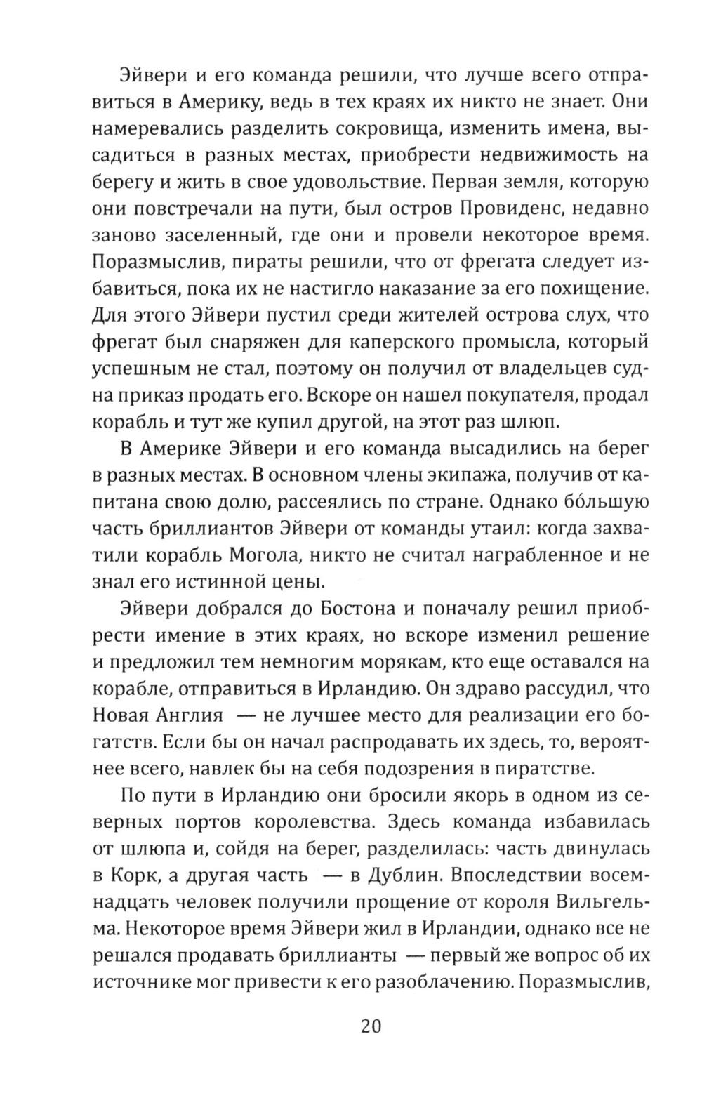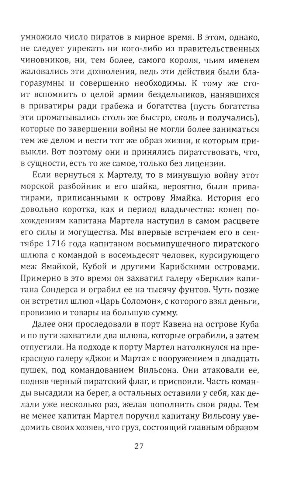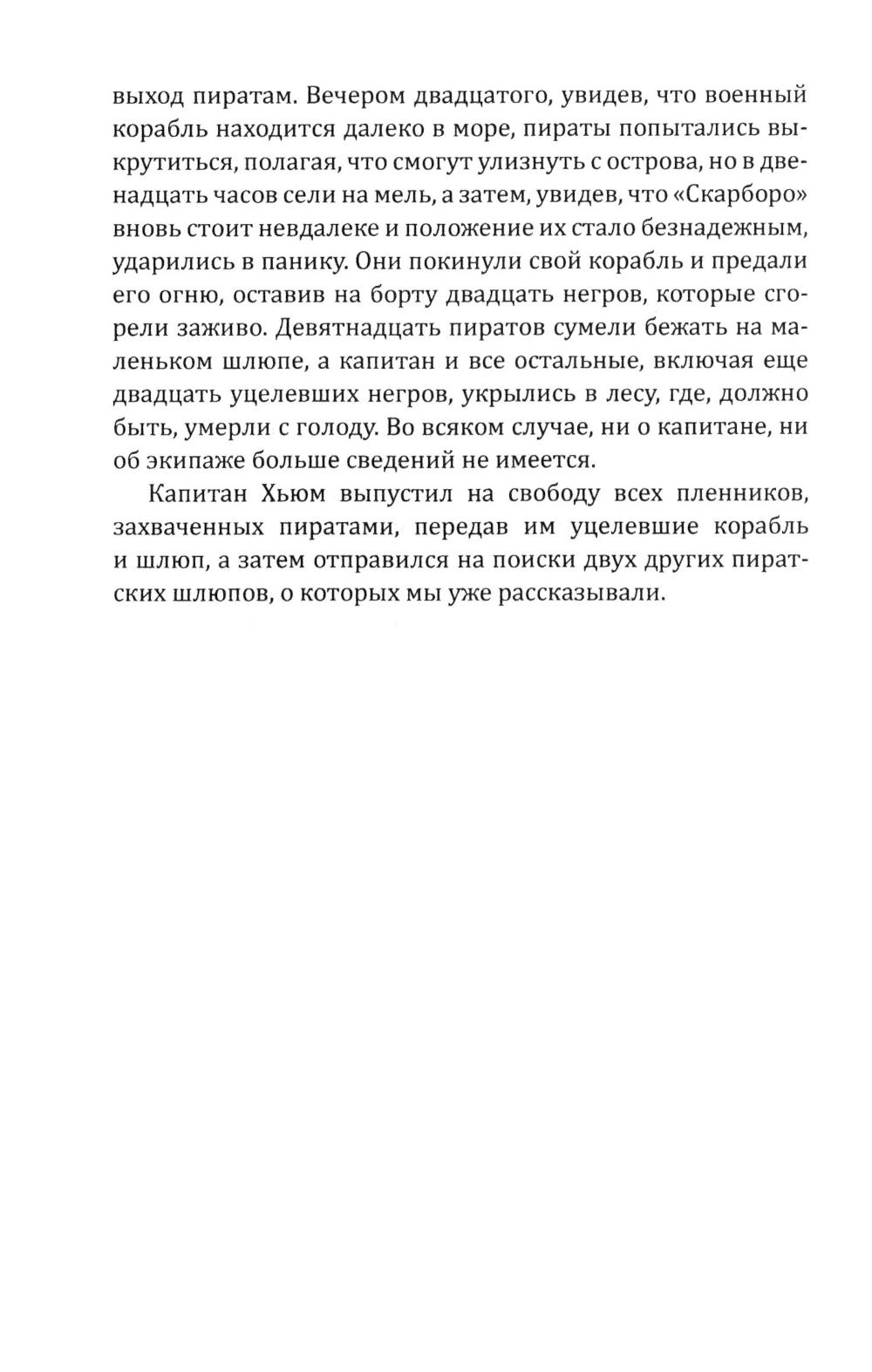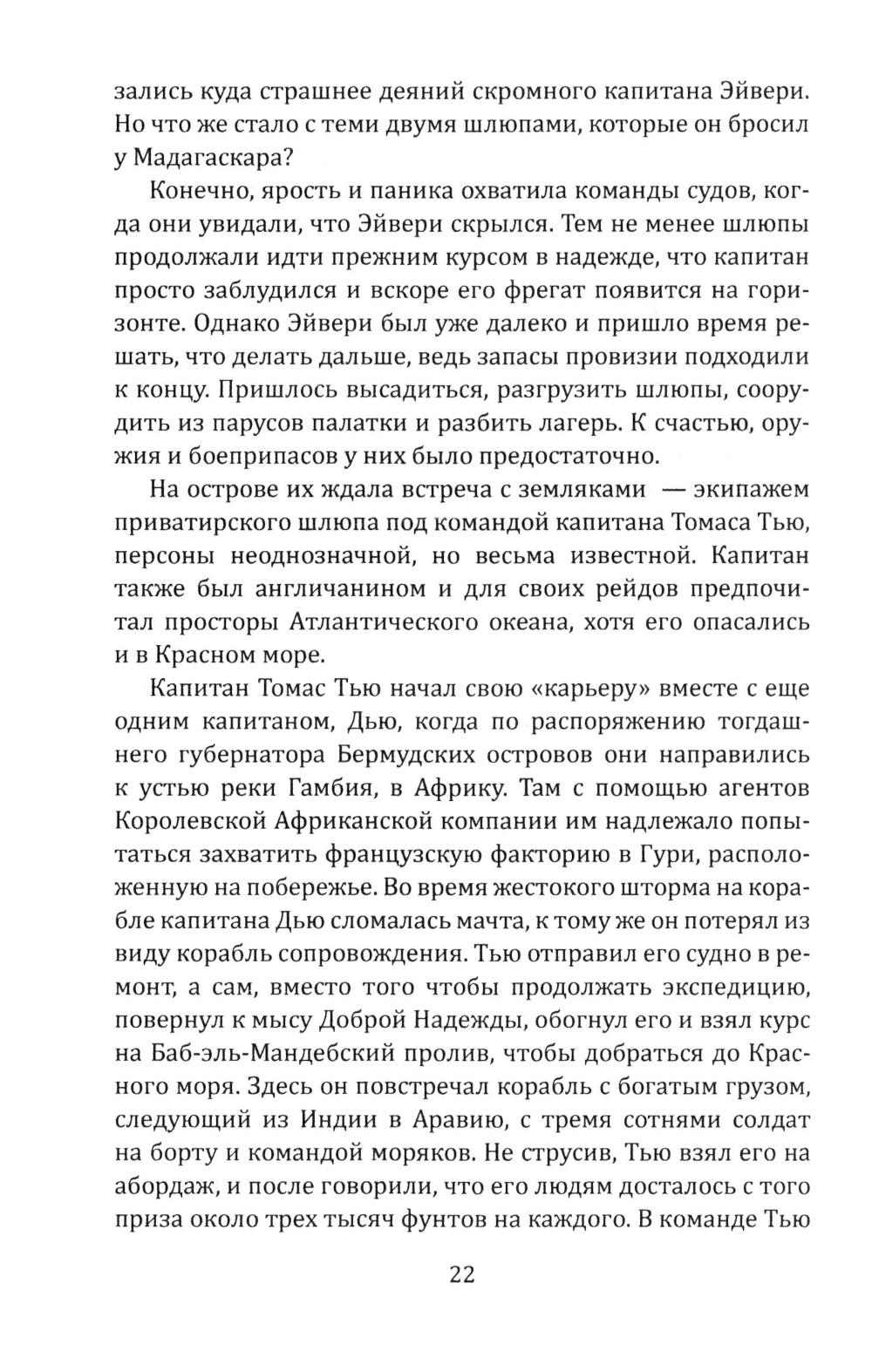 Сборник Даниэля Дефо (1660-1731) - классика мировой литературы, автора «Робинзона Крузо», открывает его классический труд об одной из самых захватывающих страниц мировой истории. Из него мир узнал о знаменитых морских разбойниках - Уильяме Кидде, Эвери, Тиче (он же Чёрная Борода); и пиратках - Мэри Рид и Энн Бонни. Об этих флибустьерах и корсарах мы читали в приключенческих романах, следили за перипетиями их судеб по любимым кинофильмам. А из этой книги мы узнаем о них всю правду! Долгое время ее авторство приписывалось «капитану Чарлзу Джонсону» (именно его имя фигурирует на титульной странице оригинала). Исследователи, однако, пришли к выводу, что «капитан Чарлз Джонсон» - один из многочисленных псевдонимов великого английского писателя Даниеля Дефо. В сборник включен также захватывающий авантюрный роман «Жизнь и пиратские приключения славного капитана Синглтона», основанный на биографии пирата XVII века Генри Эвери.| Издательство | Родина |